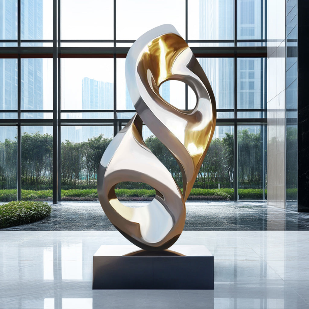 - Polished Mirror Finish: The high-gloss mirror finish enhances this modern sculpture’s reflective properties, creating dramatic light interactions.