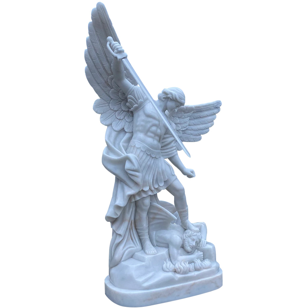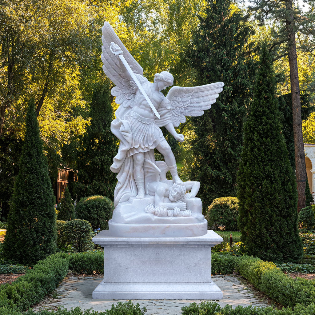 This St. Michael the Archangel Defender Sculpture is a magnificent depiction of St. Michael's triumph over evil, symbolizing strength, protection, and divine authority. The polished white marble finish enhances the statue's elegance, making it a timeless addition to outdoor or sacred spaces. With its intricate detailing and durable natural stone material, this garden defender sculpture is both an artistic and spiritual masterpiece that beautifully complements its surroundings.