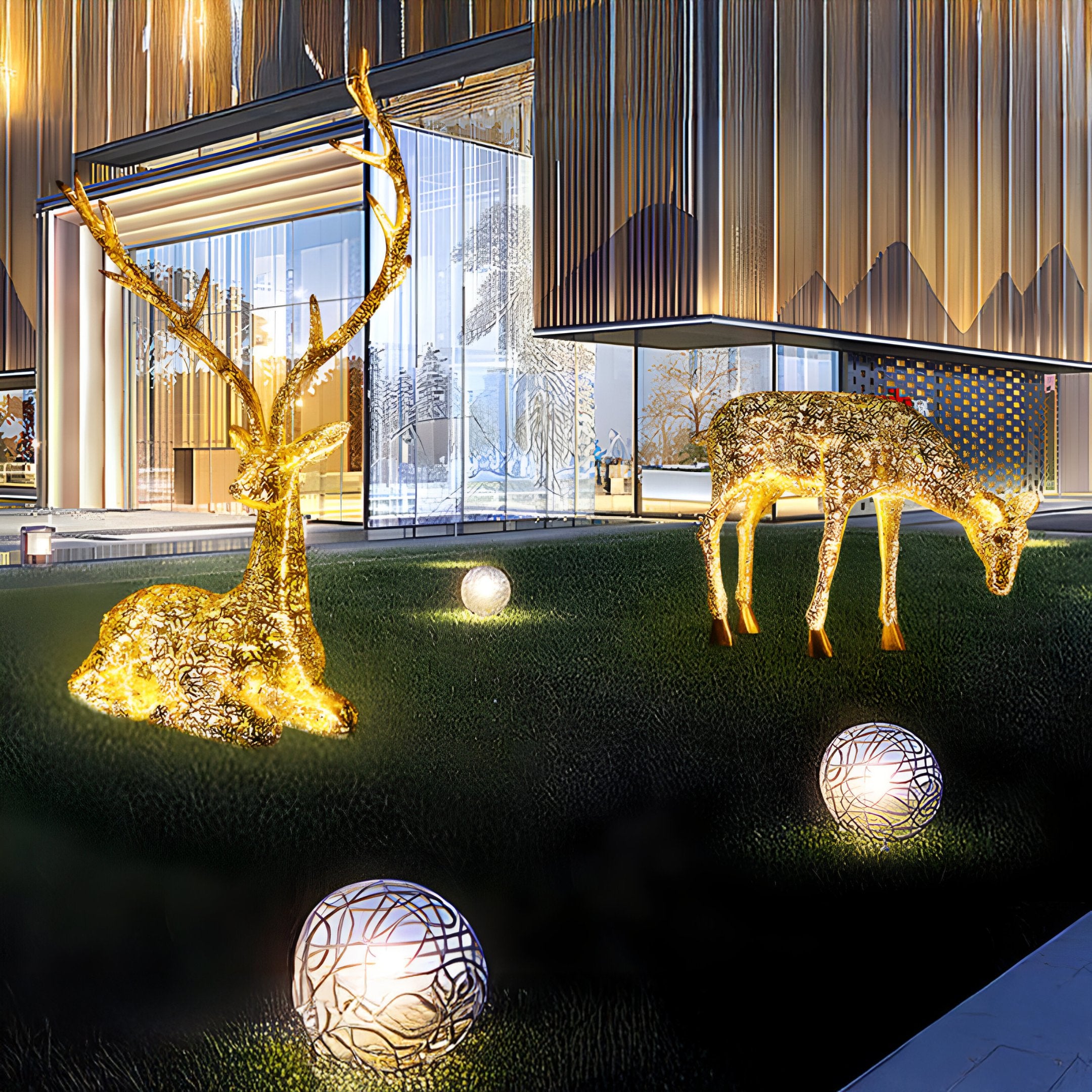 Designed for unparalleled versatility, this LED illuminated sculpture effortlessly adapts to both indoor and outdoor settings. Its weather-resistant stainless steel construction ensures durability, making it an ideal centerpiece for expansive gardens, elegant patios, spacious courtyards, or sophisticated landscaped areas where it complements natural elements and modern architectural features. Indoors, it enhances spaces such as grand living rooms, prestigious office lobbies, or contemporary art galleries, seamlessly integrating with diverse décor styles from minimalist to luxurious. The integrated LED lights not only highlight the sculpture's intricate details but also create a warm, inviting ambiance, transforming any space into a haven of artistic beauty and sophistication. Whether you're an art enthusiast or seeking to elevate your environment with a unique statement piece, this gold deer sculpture offers enduring elegance and dynamic design.
