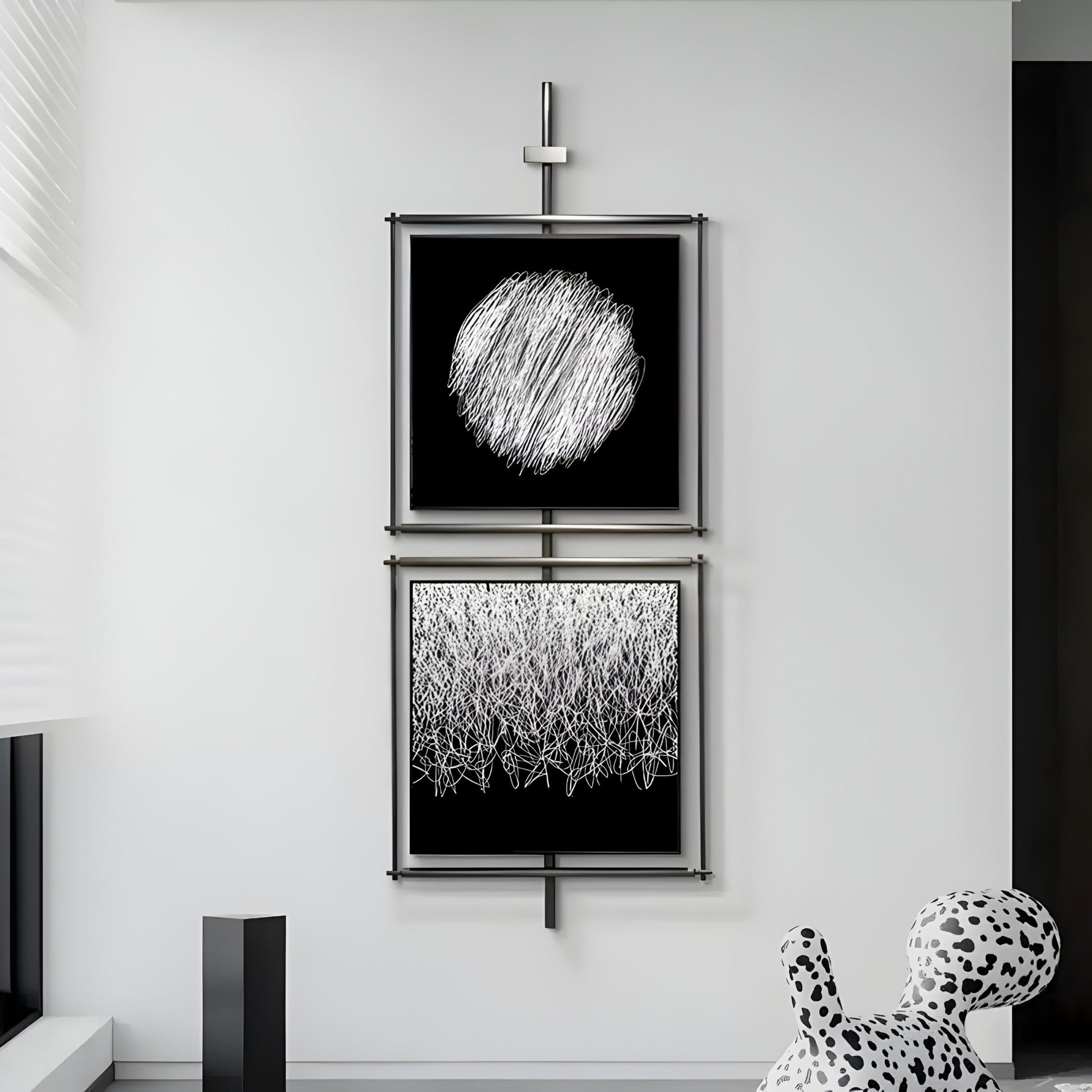 The Vistarte Lunar Textures Abstract Dual Panel Metal Wall Art offers a captivating interplay of minimalist design and artistic abstraction. This dual-panel piece features two contrasting yet harmonious compositions: the upper panel showcases a circular, lunar-inspired texture, while the lower panel displays an intricate mesh of white lines resembling a celestial field. Both panels are set against a deep black background, creating a striking visual contrast that amplifies their impact. Encased in sleek black metal frames, this artwork seamlessly integrates modern sophistication with timeless artistry.