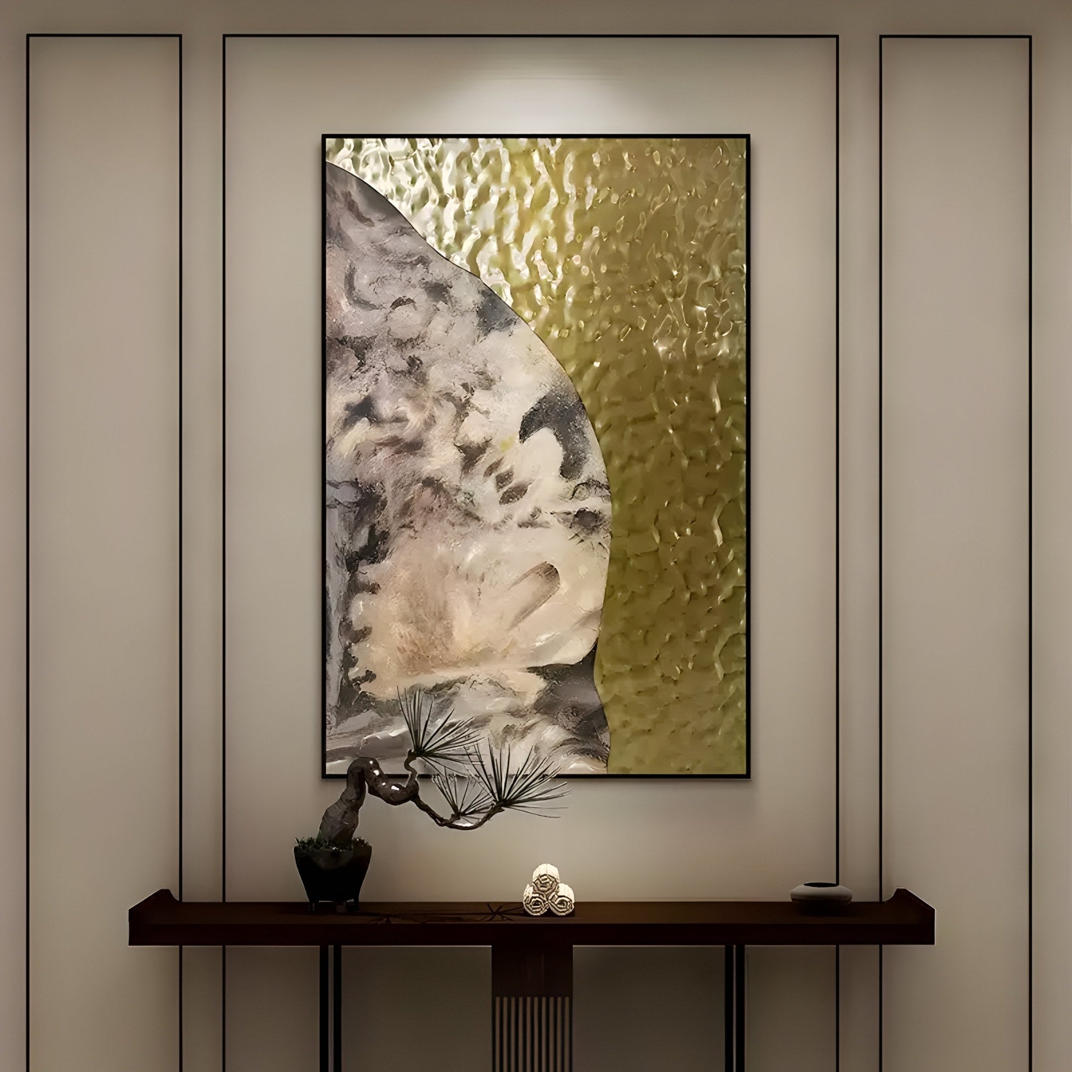 This abstract wall art serves as a striking focal point, seamlessly blending contemporary and classic styles. Its gold accent panels reflect light beautifully, while the earthy painted patterns add balance and contrast. Whether placed in a modern living room, upscale office, or luxury corridor, this artwork enhances the ambiance with its refined presence. The high-quality stainless steel construction and hand-applied textures ensure durability and uniqueness, making it a timeless addition to your art collection. Perfect for those looking to enhance their space with a mix of warmth and modernity, the Astrid Abstract Wall Art makes a thoughtful addition to homes and commercial interiors.