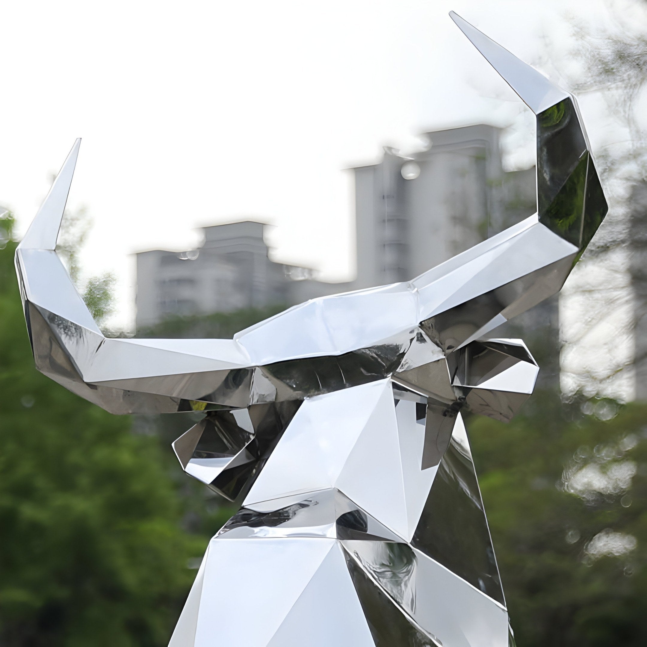 Introducing the Bull Geometric Stainless Steel Outdoor Sculpture, an impressive work of modern art that captures the strength and dynamism of a bull through sleek geometric design. This striking sculpture features interlocking angular facets meticulously crafted from high-quality stainless steel, forming a powerful representation of a charging bull. The polished metal surface reflects light beautifully, creating a captivating visual effect that changes with the environment. Standing prominently, this piece showcases exceptional craftsmanship and attention to detail, making it a remarkable focal point for any setting.