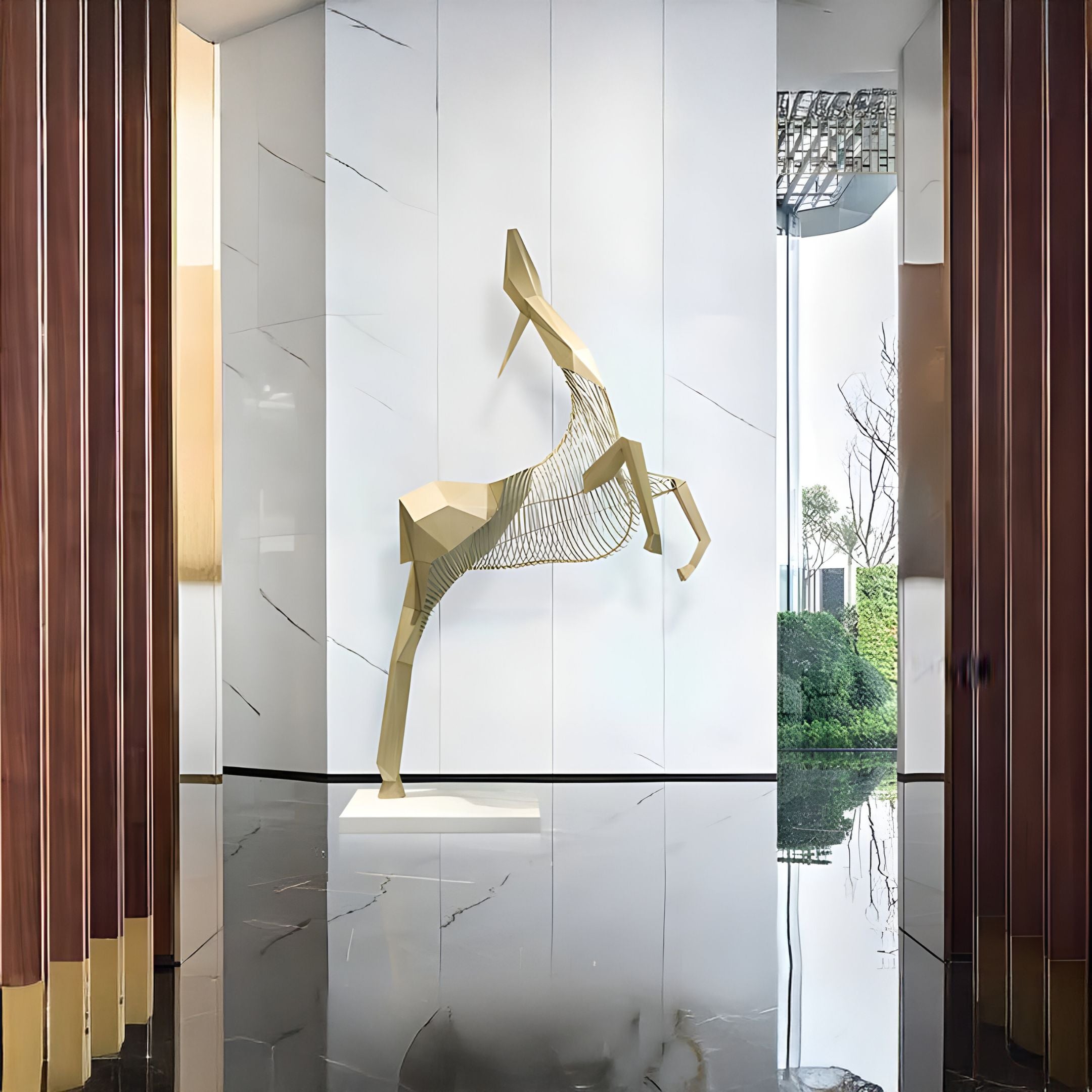 Designed for versatility, this wireframe deer sculpture enhances both indoor and outdoor environments. Its durable, weather-resistant construction makes it ideal for gardens, patios, or courtyards, where it complements natural surroundings and adds a touch of sophistication. Indoors, it serves as a stunning focal point in living rooms, lobbies, or galleries, harmonizing with various décor styles from minimalist to industrial. The sculpture's abstract geometric structure not only enriches your space aesthetically but also stimulates conversation and contemplation. Whether you're an art enthusiast or seeking to make a bold statement, this modern gold stainless steel deer sculpture offers timeless appeal and artistic innovation.