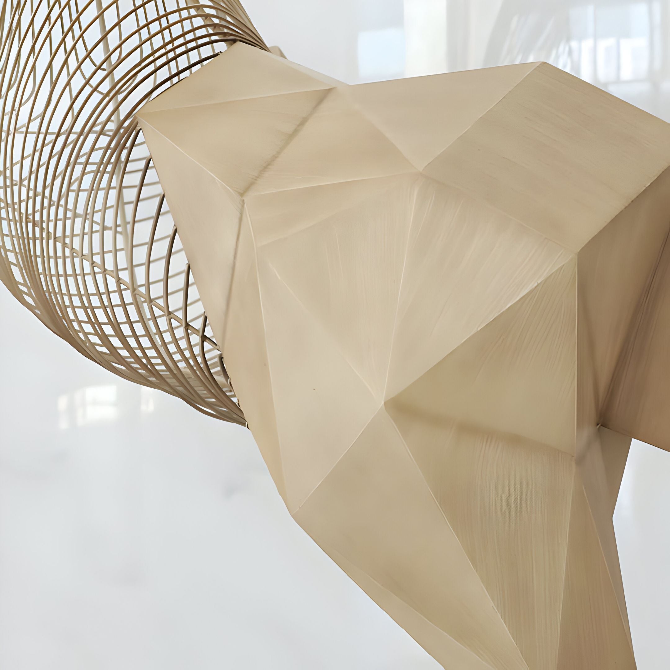 Introducing a captivating piece of modern art, this gold geometric wireframe deer sculpture combines elegance with contemporary design. Expertly crafted from high-quality stainless steel and finished with a luxurious gold coating, the sculpture features an intricate wireframe construction that outlines the graceful form of a deer. The minimalist geometric lines and polished gold finish create a striking visual effect, allowing light to pass through and casting dynamic shadows. This open design invites viewers to appreciate the delicate balance between form and space, making it a compelling centerpiece for any setting.