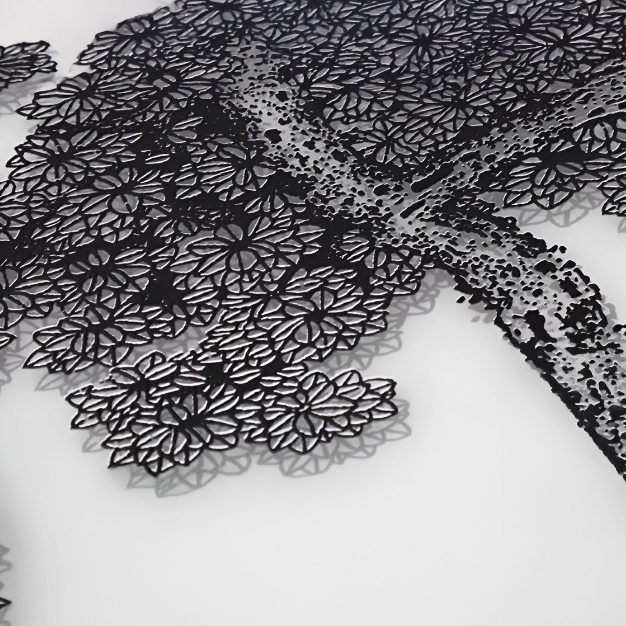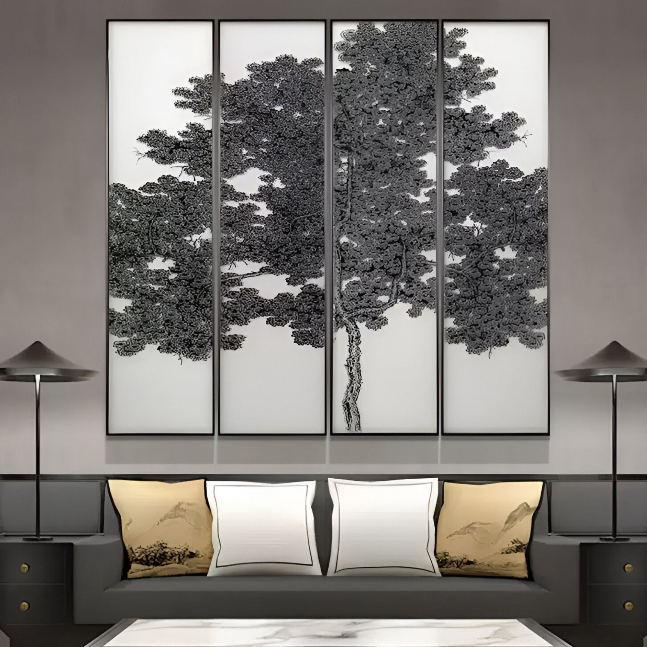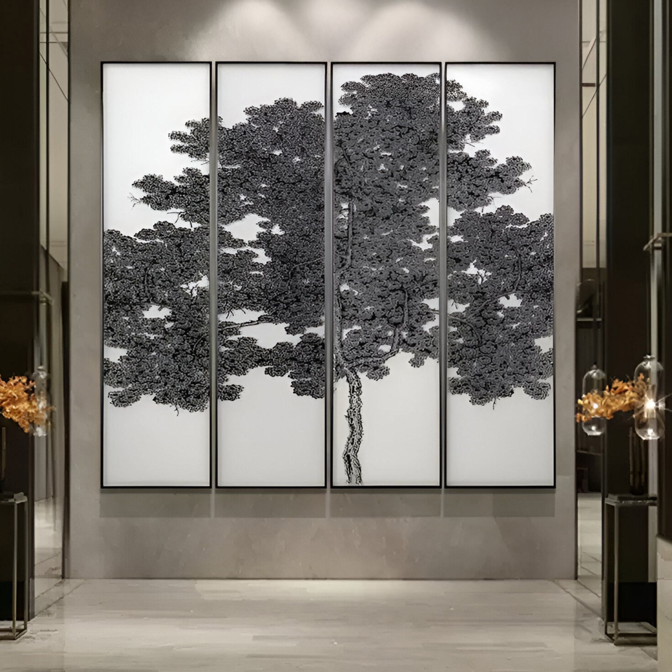 This stunning four-panel Silk Art piece brings the beauty of nature into your space with a modern and sophisticated touch. Featuring a majestic tree design, rendered in intricate black patterns against a luminous white silk-inspired background, this artwork exemplifies the harmonious blend of nature and contemporary artistry. The fine laser-cut detailing gives the piece a rich texture, mimicking the soft sheen and elegance of silk. Each panel contributes to the overall masterpiece, creating a versatile and timeless centrepiece for any indoor environment. Crafted to perfection, the Silk Art panels enhance the ambiance of living rooms, hallways, or entryways with their unique interplay of light and shadow. The monochromatic black and white palette ensures it complements a variety of interior styles, from minimalist to modern luxury.