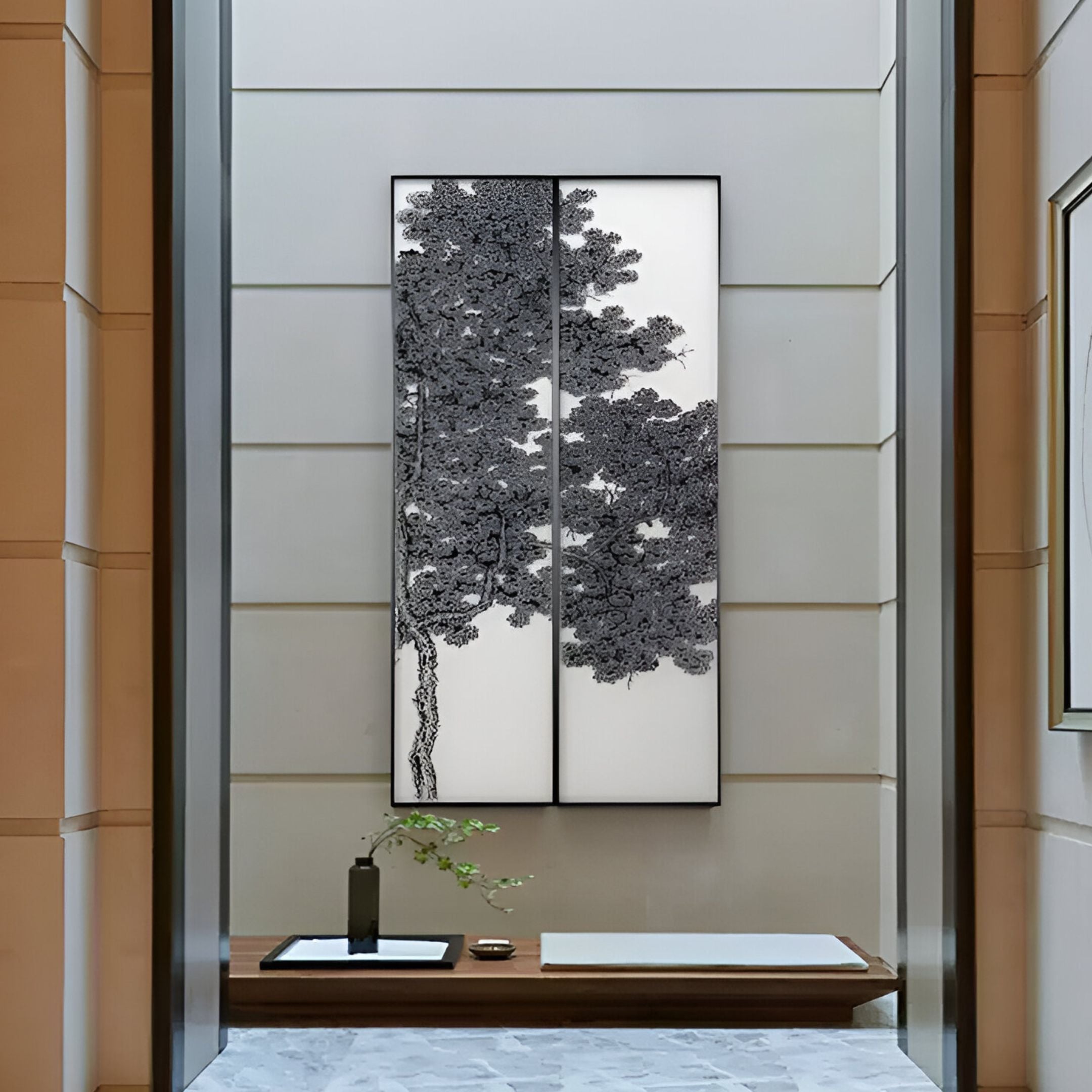 Versatile and impactful, this Silk Art wall decor fits seamlessly into residential and commercial spaces alike. The vertical structure adds height and grandeur to living rooms, dining areas, or office lobbies, creating a serene yet sophisticated atmosphere. The intricate tree design, enhanced by the silk-like backdrop, invites closer inspection and admiration. Ideal for contemporary interiors, this piece merges timeless artistry with modern appeal. Bring the soft beauty of nature indoors with this luxurious Silk Art masterpiece.