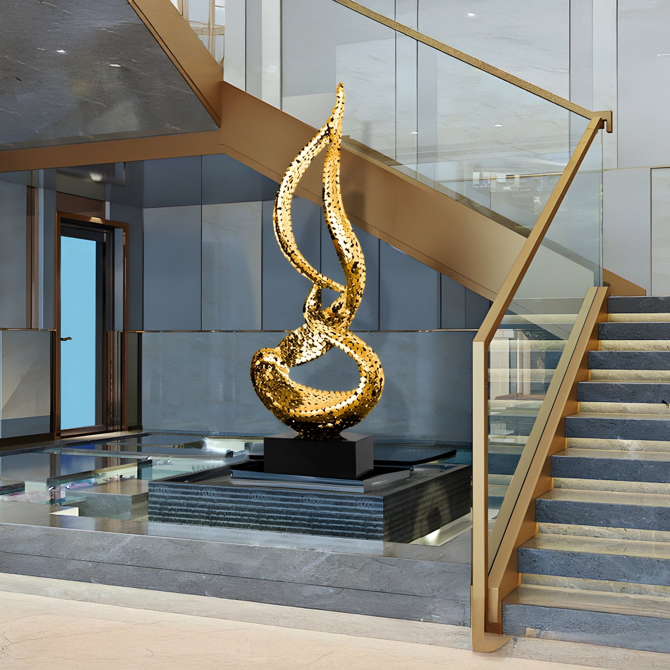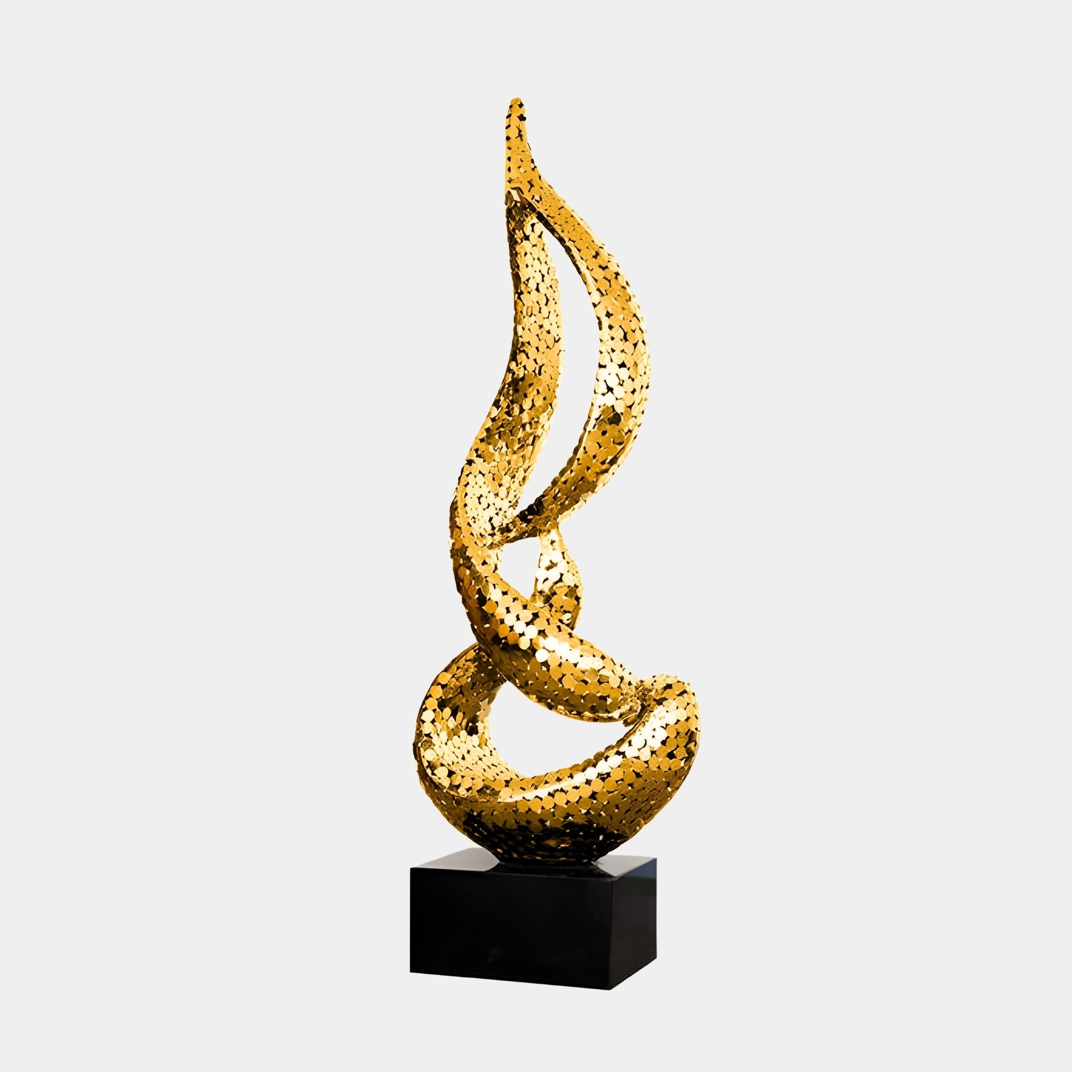 The Flare Gold Abstract Sculpture is designed to seamlessly integrate into various settings, offering both aesthetic beauty and durability. Its weather-resistant construction ensures that it maintains its stunning appearance in outdoor spaces such as gardens, patios, and courtyards. Indoors, it serves as an eye-catching focal point in areas like living rooms, office lobbies, and art galleries, complementing a range of décor styles from minimalist to opulent. The sculpture's polished gold finish not only enhances its reflective surfaces but also adds a warm, inviting glow to your surroundings. Whether you're an art collector or looking to enhance your space with a unique statement piece, the Flare IV Gold Sculpture delivers timeless elegance and artistic excellence.