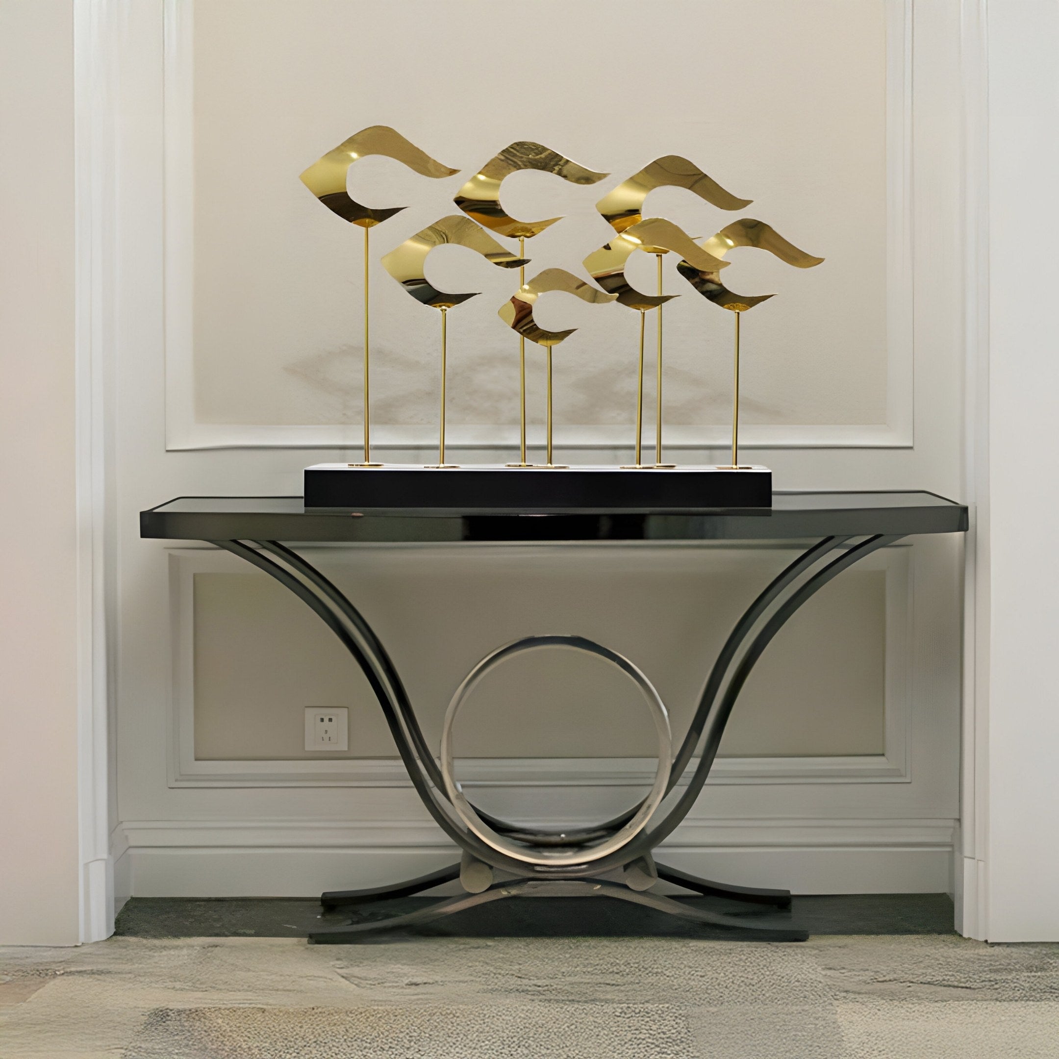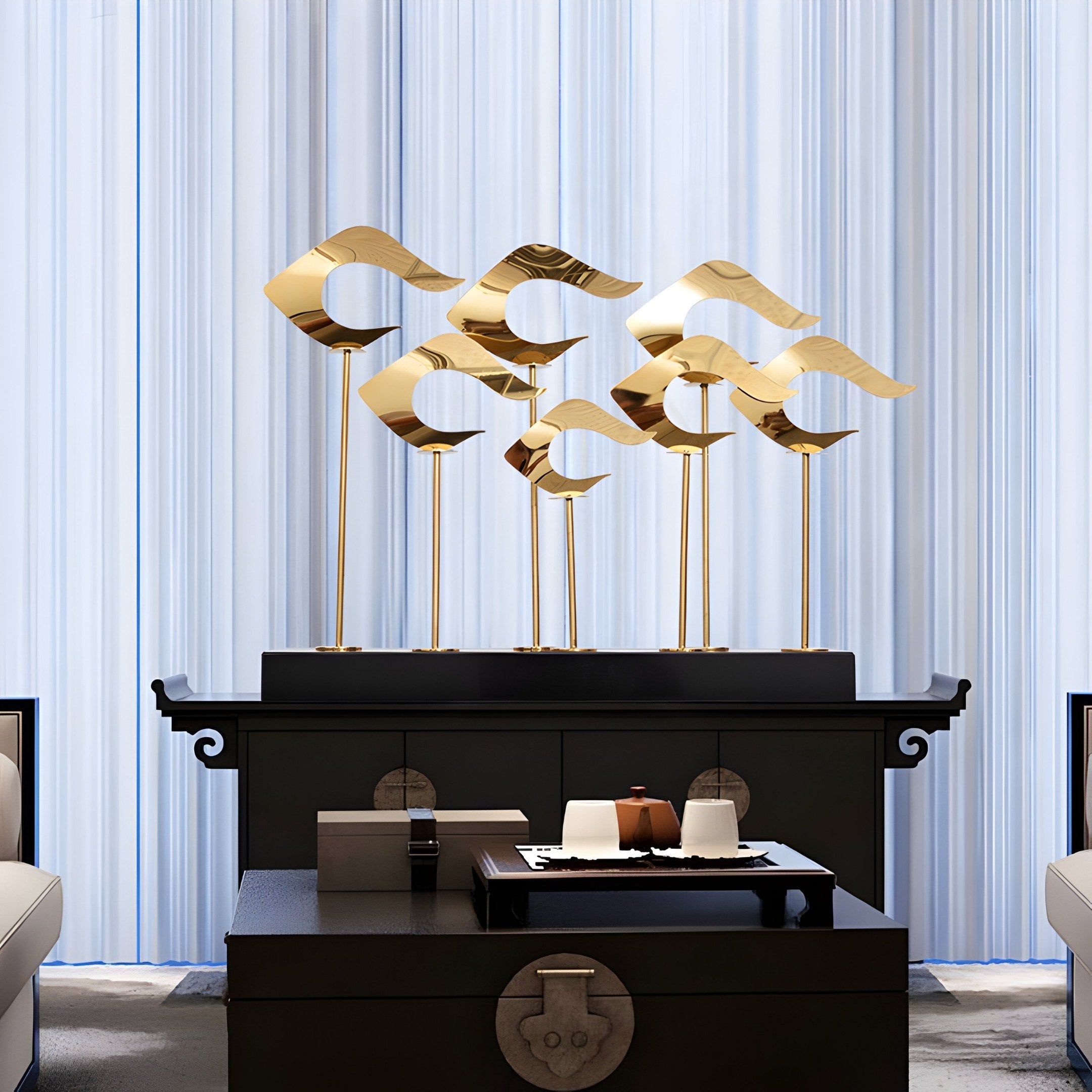 Experience the radiant allure of the Golden Drift Abstract Stainless Steel Sculpture. This striking artwork showcases fluid, intertwining forms that evoke the graceful movement of drifting waves or swirling winds. Crafted from high-quality stainless steel, the sculpture features a luminous gold finish that enhances its reflective surfaces, creating captivating light patterns as it interacts with its surroundings. The abstract design invites personal interpretation, making it a versatile centerpiece that seamlessly integrates into various settings. Whether displayed in a contemporary living space or an elegant outdoor garden, the Golden Drift sculpture adds a touch of modern sophistication and artistic flair.