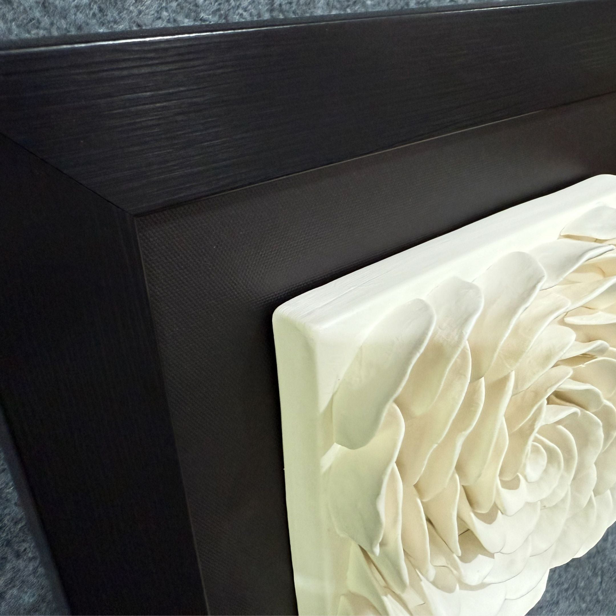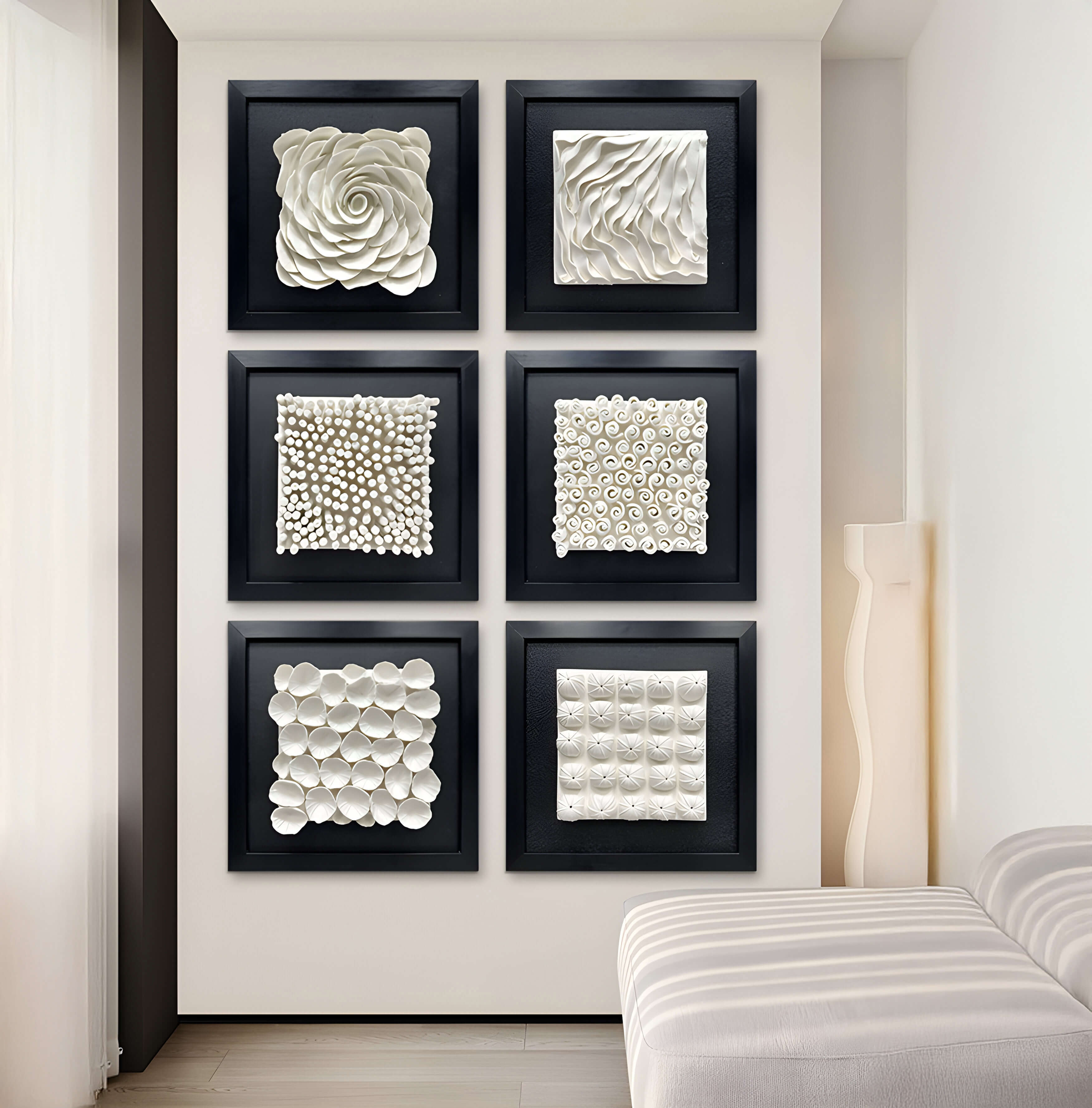 Six stunning 3D ceramic wall sculptures combine texture, artistry, and modern design, each beautifully framed in black borders. Unique arrangements of off-white ceramic elements include flowing waves, delicate spirals, floral-inspired forms, and structured grids, offering a mix of organic and geometric aesthetics. The contrast between the textured ceramic surfaces and the bold black frames creates visual depth and a sophisticated gallery-like presentation, ideal for contemporary and minimalist interiors. Each design brings individuality while maintaining a cohesive, modern look. The three-dimensional ceramic forms interact with light and shadow, adding movement and dimension to the artwork.