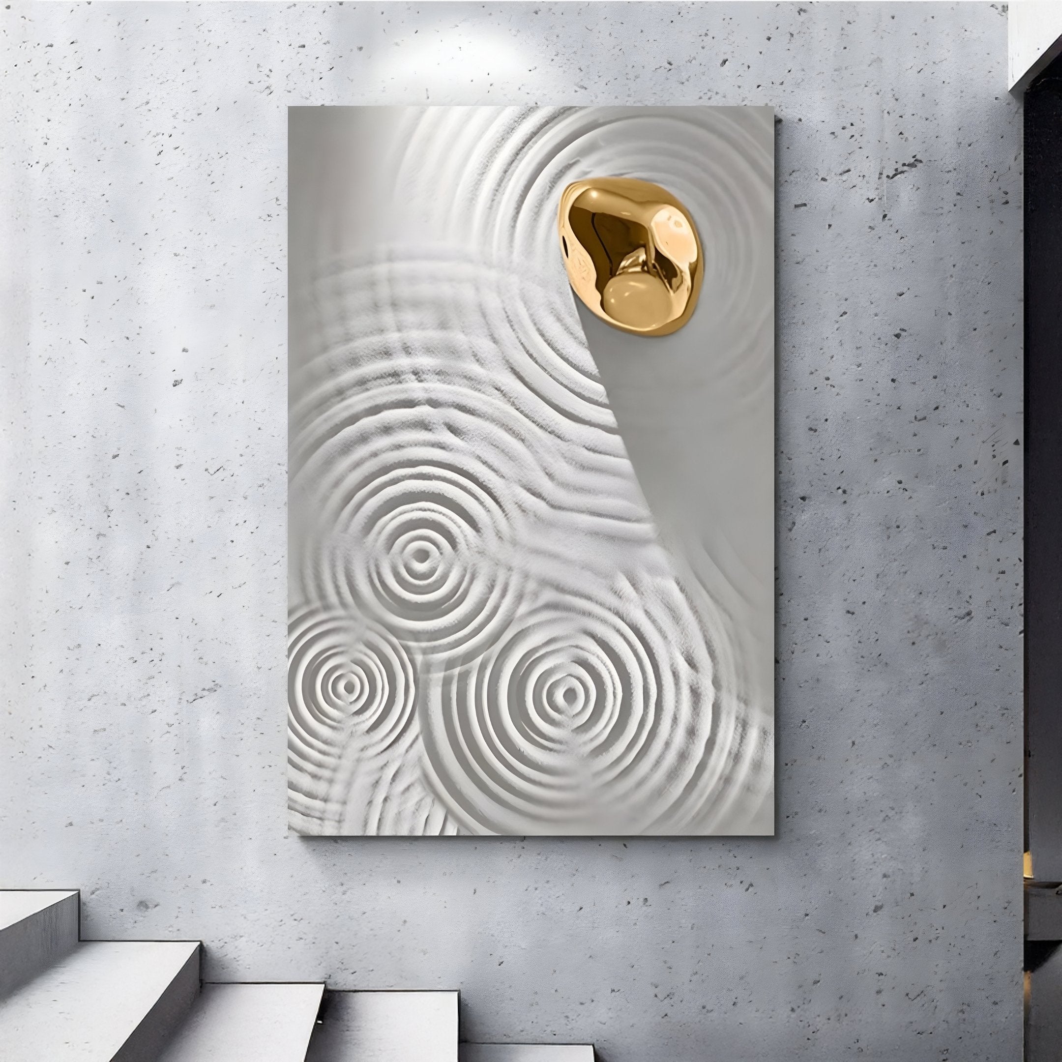 Carved from wood and hand-finished to capture the elegant fluidity of raindrop ripples, the Ondella Gold Ripple IV Sandstone Wood Relief 3D Wall Art adds a gentle yet captivating presence to modern spaces. Concentric rings radiate across a muted, sand-toned surface, recalling the calming pattern of water disturbed by a single drop. A highly polished gold accent, positioned at one edge, breaks the monochrome palette with a reflective highlight. The interplay between the matte, carved textures and the metallic gleam introduces a subtle dynamic that suits minimalist or wabi-sabi-inspired interiors.