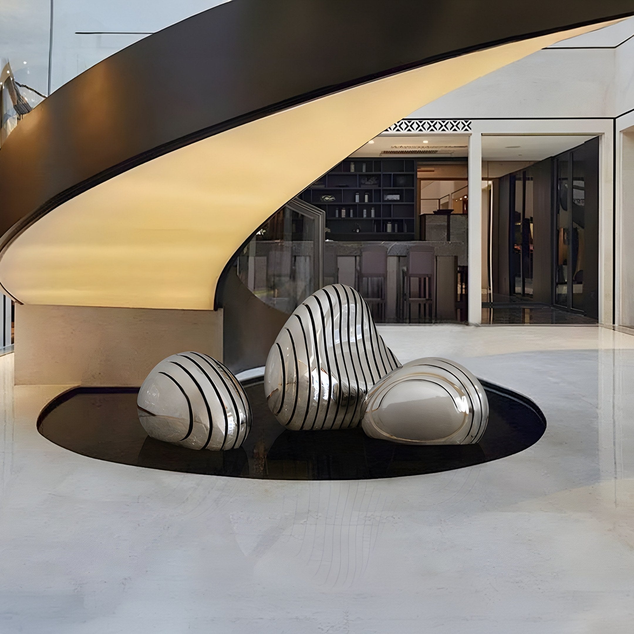 Perfectly suited for both outdoor and indoor locations, this modern sculpture marries robustness with aesthetic beauty. Its weather-resistant stainless steel composition guarantees longevity, making it ideal for placement in gardens, courtyards, or near water features where it harmoniously interacts with natural elements. Indoors, it becomes a mesmerizing centerpiece in living areas, entryways, or corporate settings, complementing interior designs from minimalist to modern. The Ripple Silver Organic Steel Sculpture not only enhances visual appeal but also symbolizes the seamless blend of art and nature, making it an exceptional choice for those aiming to enrich their surroundings with a unique and inspiring piece.