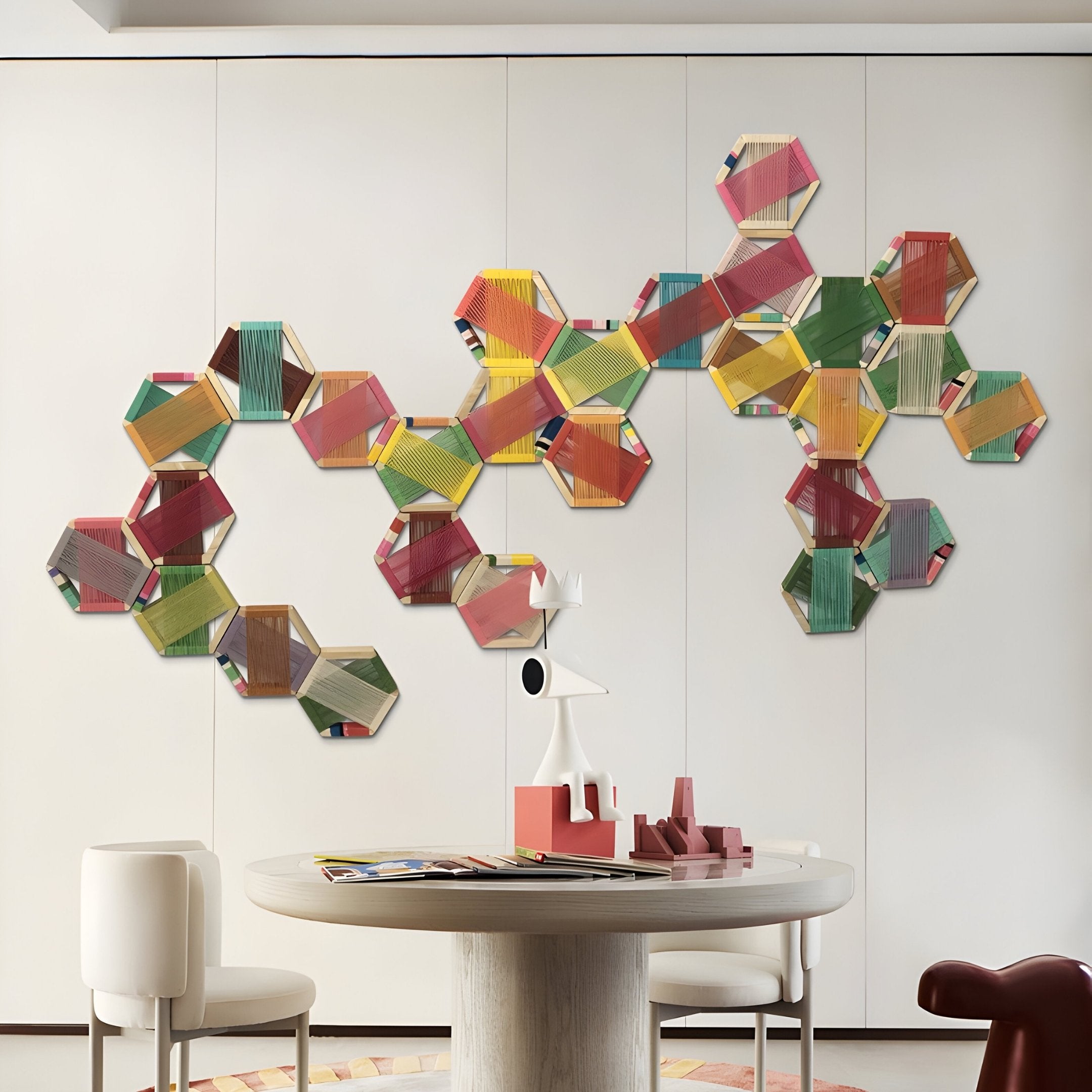 The Spectra IV Multicoloured Interwoven Hexagonal Frame 3D Wall Art is a striking display of geometry, texture, and vibrant hues, crafted to enhance contemporary interiors. Featuring an intricate network of interwoven hexagonal frames, this piece blends a solid wood structure with vividly hand-dyed wool. The colourful threads bring energy and depth, while the wooden hexagonal framework creates a balanced, geometric design. The thoughtful arrangement of shapes and colours forms a playful, modern aesthetic that can complement walls in living spaces, creative studios, or offices. Designed for durability and artistic impact, this wall art is both a functional and decorative masterpiece.