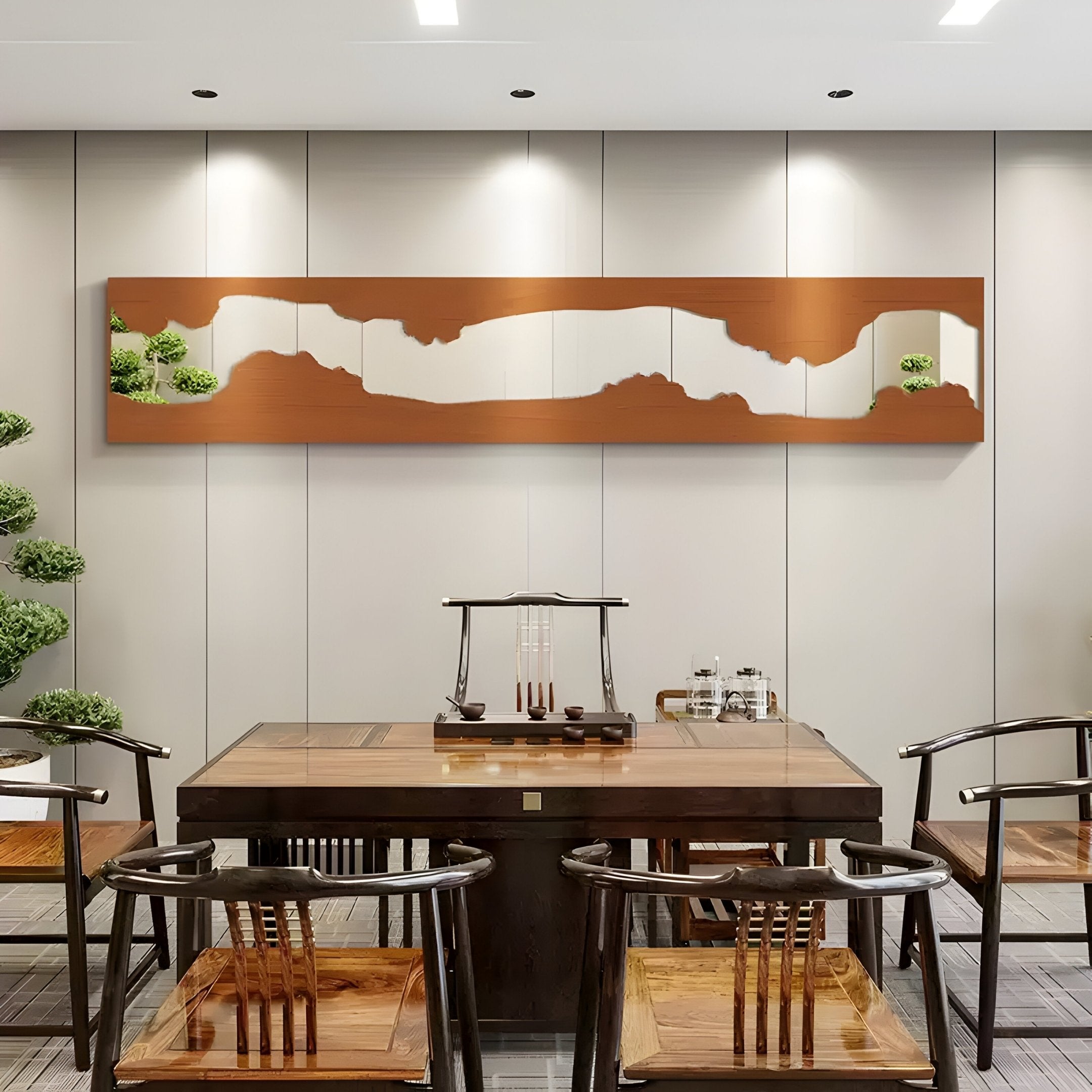 The Stratara Red Rustic Wood Carving Mirror Linear Wall Art combines natural textures with reflective surfaces, creating a statement that’s both earthy and sophisticated. This piece features a handcrafted wooden panel in a rustic red hue, intricately carved to mimic organic landscapes. A central mirror flows through the design, enhancing depth and creating a dynamic play of light. Its elongated, linear format makes it a versatile option for wide spaces such as dining rooms, living areas, or hallways, serving as a focal point that complements traditional and modern interiors alike.