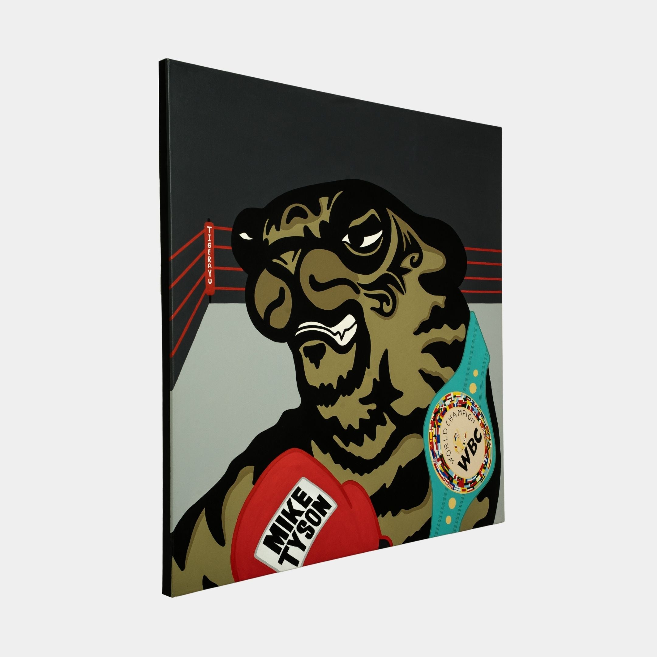 The Tyson Tiger Pop Art Canvas Painting merges the spirit of a boxing champion with the playful flair of modern pop art. A resolute tiger figure takes centre stage, sporting a bright championship belt that echoes the glory of the boxing world. A boxing glove, emblazoned with a famous name, hints at legendary status, while the background features the ropes of a ring in deep red lines. Painted on premium canvas using acrylics, this artwork presents striking contrasts between the tiger’s dark stripes and the grey tones that frame the scene. The careful composition ensures each detail, from the fierce expression to the bold text on the glove, stands out vividly, creating a piece that captures both power and style.