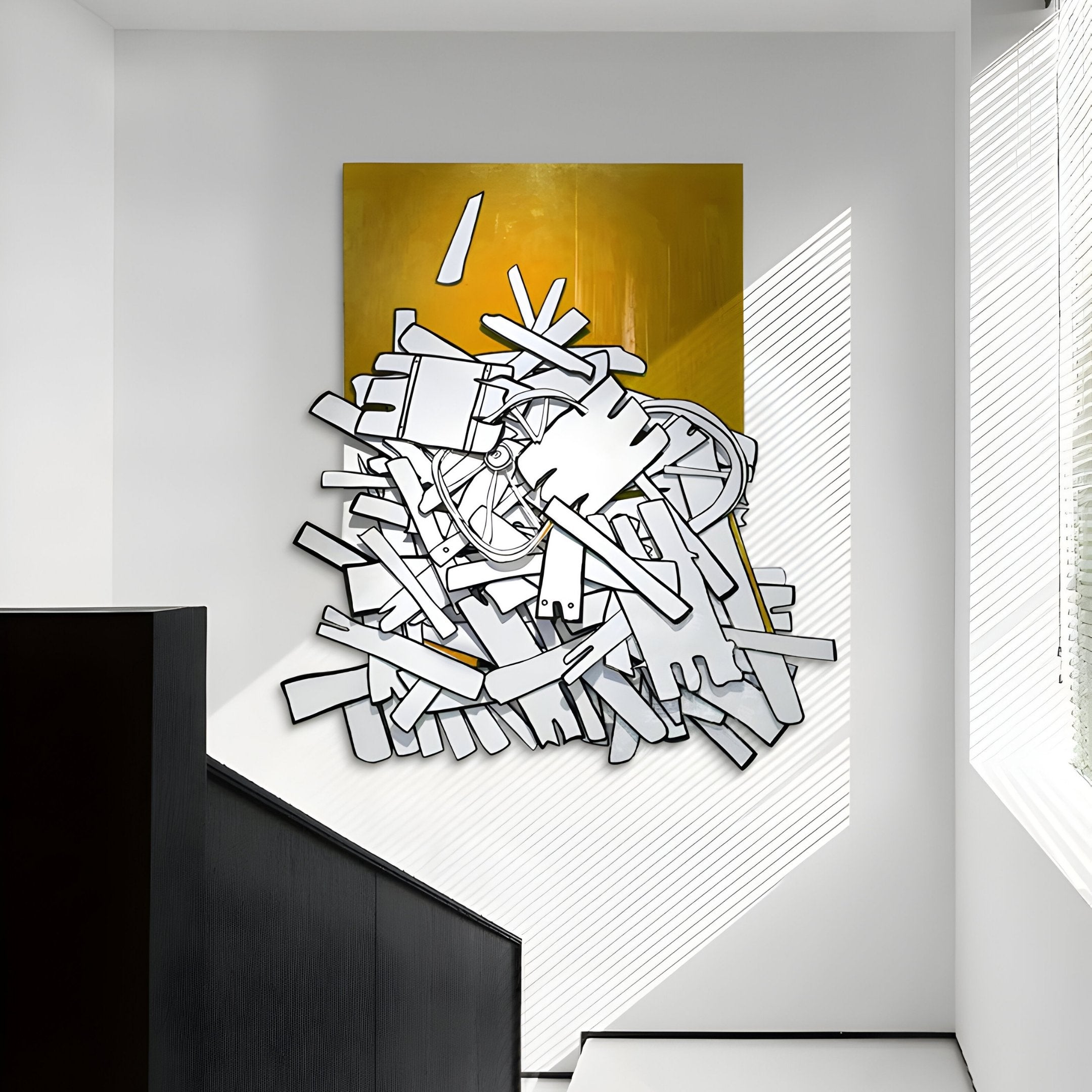The Assemblia Yellow Hand-Painted Wood Graffiti Wall Art is a striking creation that pairs a warm yellow backdrop with an array of white, cut-out shapes outlined in black. Each shape, from offcuts to playful wheel-like forms, is arranged in a layered manner, producing a sense of energy and depth. A closer look reveals smooth edges, neat paint lines, and considered positioning, highlighting the level of care that went into assembling each element. The vibrant yellow base enhances the strong contrast with the white silhouettes, making the entire piece stand out in rooms with neutral or darker walls.
