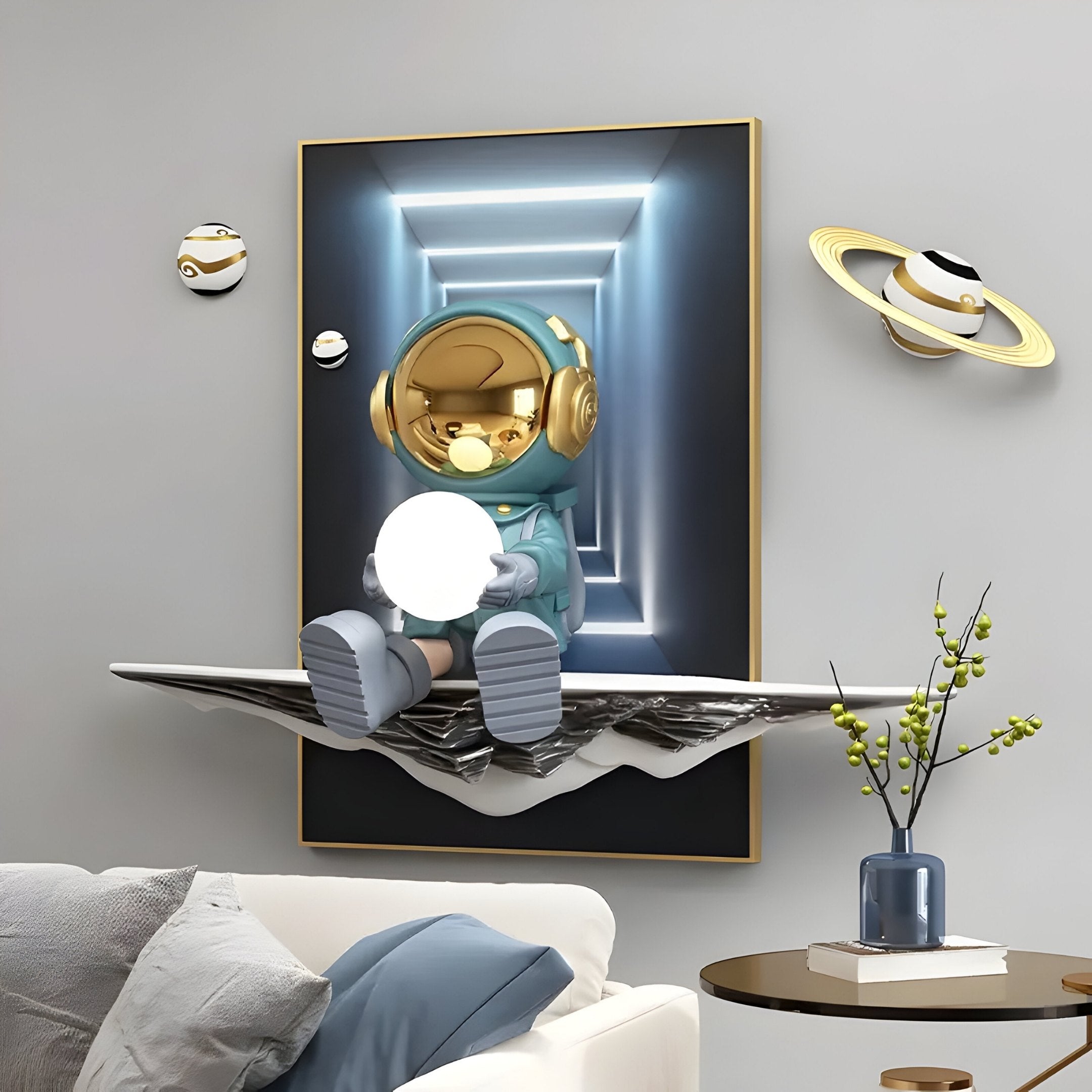 Mounting is straightforward, and a gentle wipe keeps the resin surfaces and metallic details looking pristine. Whether displayed in a lounge, bedroom, or creative studio, the astronaut’s gentle glow doubles as a comforting accent when daylight fades. Pair it with star-patterned cushions or lunar-inspired accessories for a cohesive cosmic vibe, or let it shine on its own as a conversation starter. The interplay of blues, golds, and monochrome tones complements a variety of interior styles, from modern flats to eclectic homes. Let the Blue Astronaut Glow 3D Portal Wall Art remind you that curiosity can guide us to new frontiers, even within the walls of everyday life.