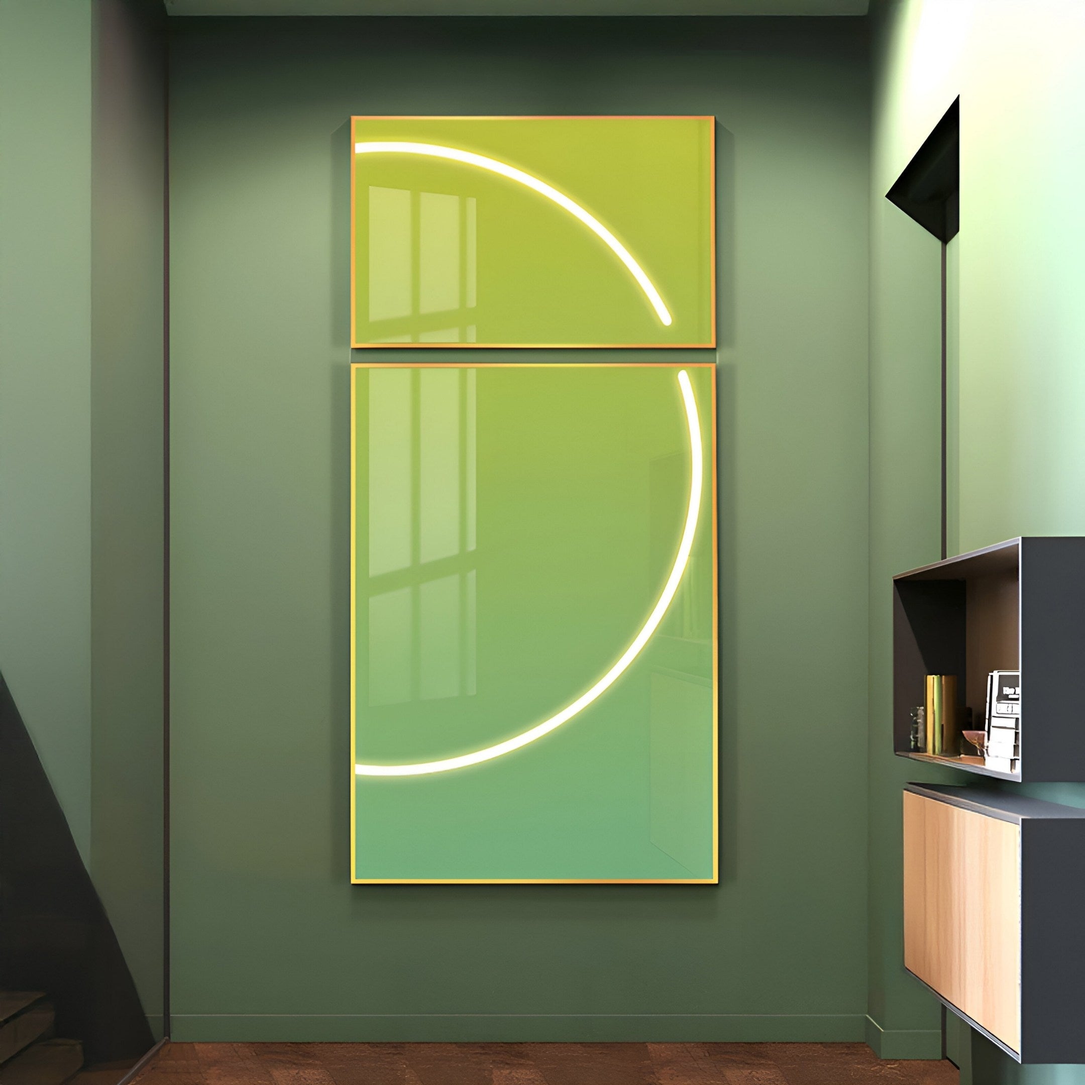 Enigma Lime Jade LED Wall Art offers a lively burst of color paired with a smooth, glowing arc. Each of the two panels can be produced in either crystal porcelain or oil painting canvas, giving you flexibility in aesthetic and finish. The distinctive green gradient delivers a fresh, uplifting energy suitable for creative living spaces and stylish commercial areas. Framed by a robust aluminum edging, these panels maintain a crisp outline that unifies the overall presentation. The integrated LED arc connects to a mains plug for straightforward power, emitting a soft brightness that elevates the mood of the room.