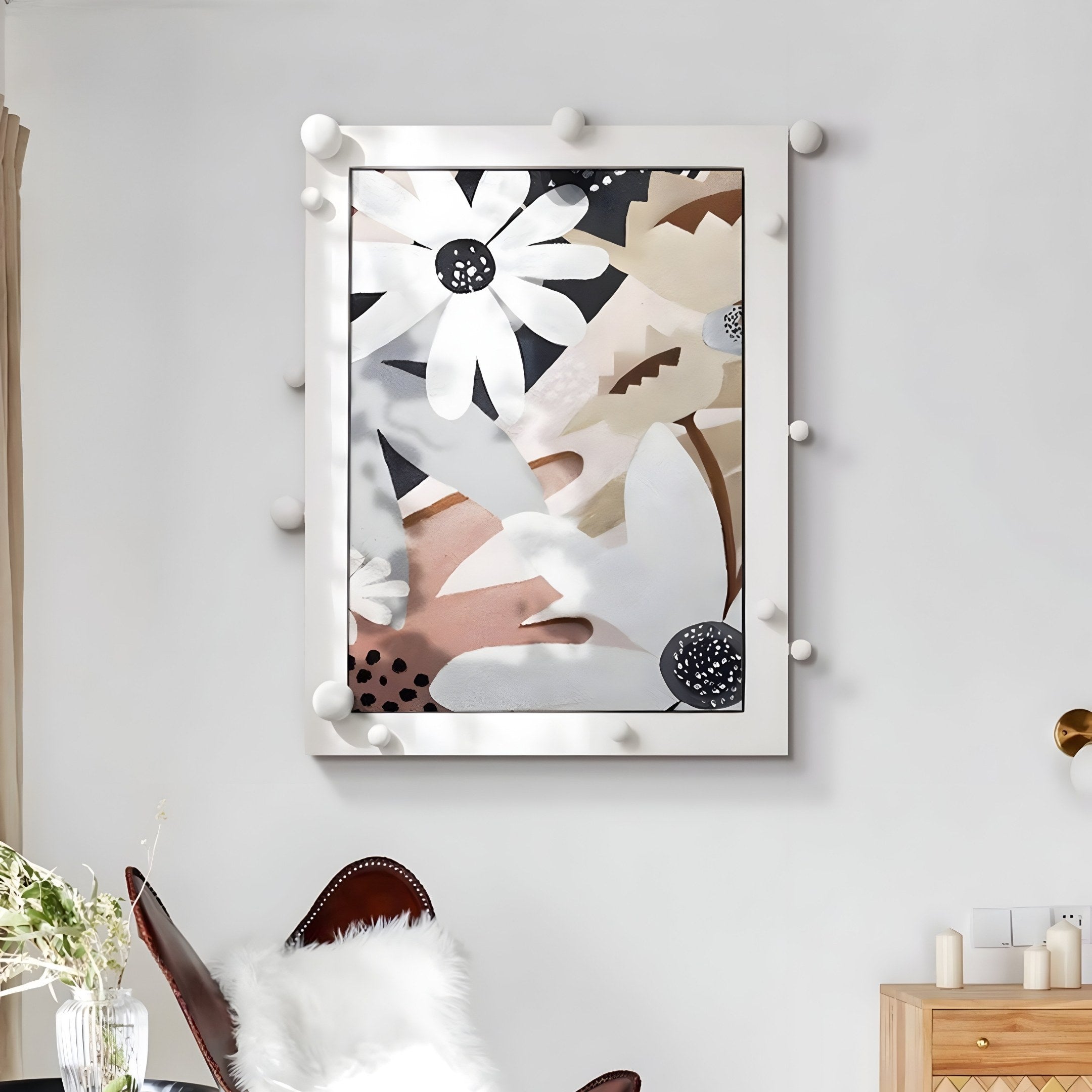 Composed of intricately layered sandstone and refined with gentle brushstrokes, the Florere Neutral Bloom Hand-Painted Sandstone 3D Wall Art balances soft floral forms with a calming palette. Distinctive white daisies pop against warm taupe and cream elements, offering a contemporary yet cosy look. Subtle touches of charcoal further define the blossoms, accentuating the artwork’s three-dimensional quality. The textured finish endows each petal with a tangible depth, rewarding closer inspection. A white frame, dotted with spherical protrusions, enhances the piece’s modern character by adding hints of playful geometry. The harmonious mix of neutrals ensures compatibility with a variety of interior designs, from Scandi-inspired lounges to more rustic living areas.
