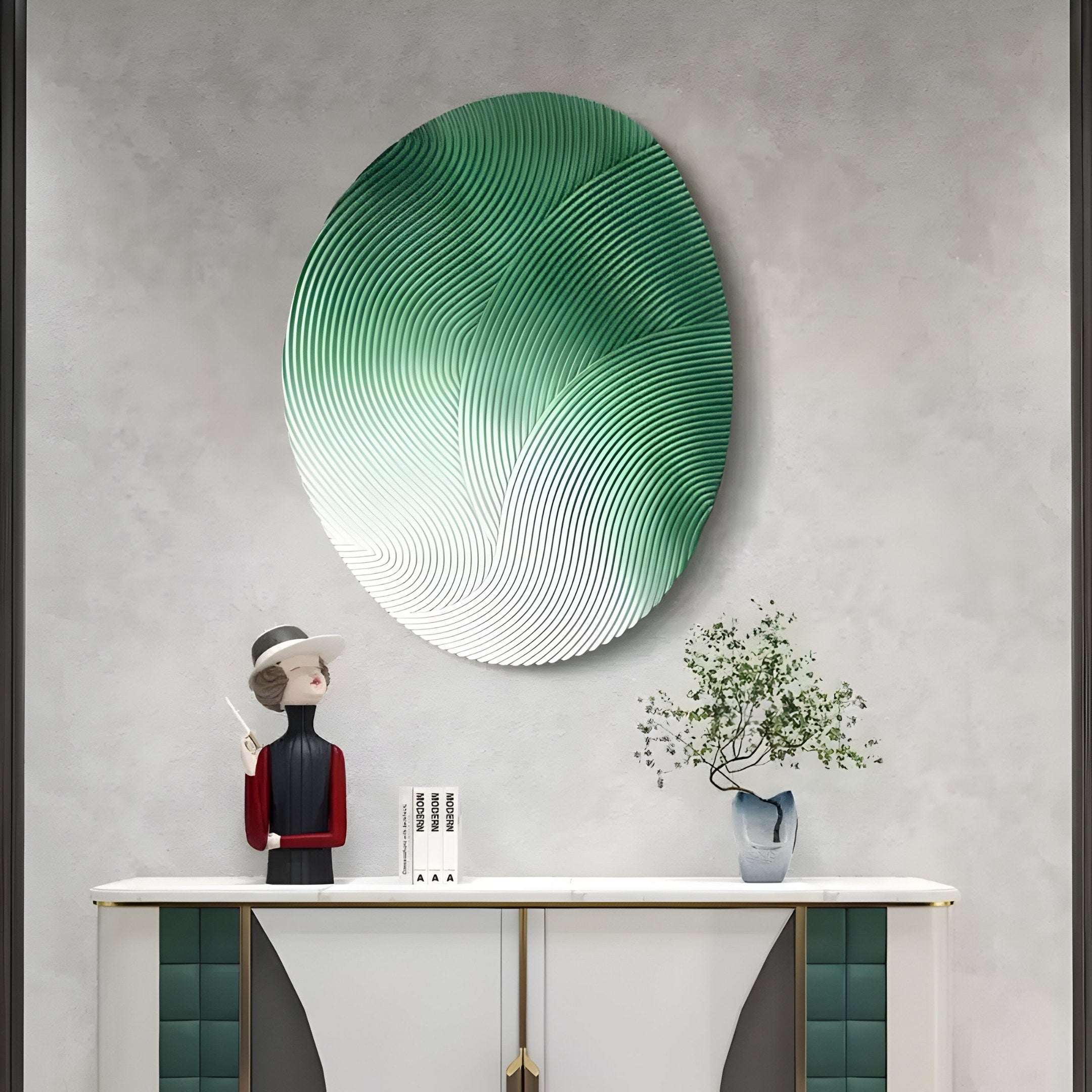 Carved from robust wood with a gently textured, sandstone-inspired finish, the Fluctus Green Textured Sandstone Wood Relief 3D Wall Art showcases wave-like grooves that suggest a soothing, natural flow. Its oval shape transitions from a deep green at the top to a soft white at the bottom, producing a subtle gradient that draws the eye. Each carved line is carefully sculpted, creating an interplay of light and shadow that changes throughout the day. The hand-applied paint emphasises the artwork’s organic curves, lending both visual depth and a tactile quality. A sturdy wooden base supports the intricate detailing, making this piece a suitable choice for living rooms, hallways, or bedrooms with a modern or nature-inspired theme. Its calming presence encourages viewers to pause, evoking a sense of serenity.