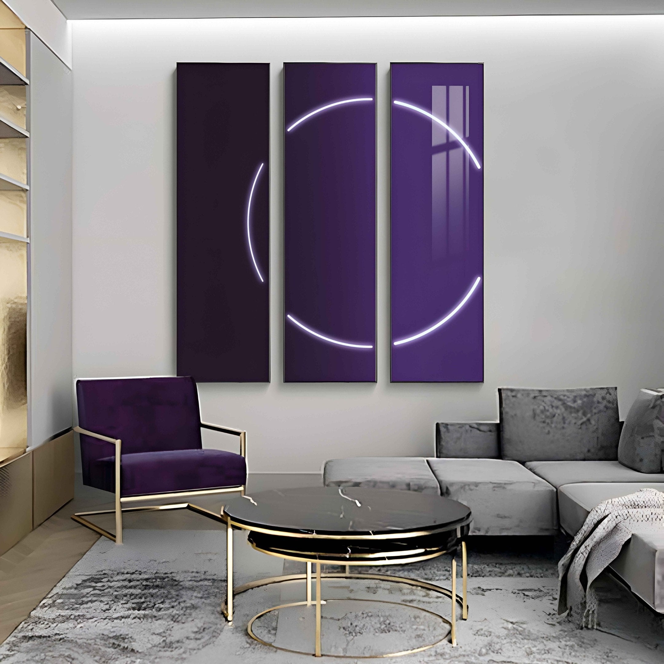 Helios Amethyst Crystal Porcelain LED Wall Art radiates a regal, purple hue that transforms contemporary interiors into serene, visually striking environments. Crafted with premium crystal porcelain panels, the piece exhibits a gentle translucence that comes alive under different lighting conditions. A circular LED feature sits at the center of the three-panel design, drawing the eye to its soft, amethyst glow. Each panel is enclosed in a refined metal frame, ensuring both stability and a clean finish that suits modern and transitional decor styles.