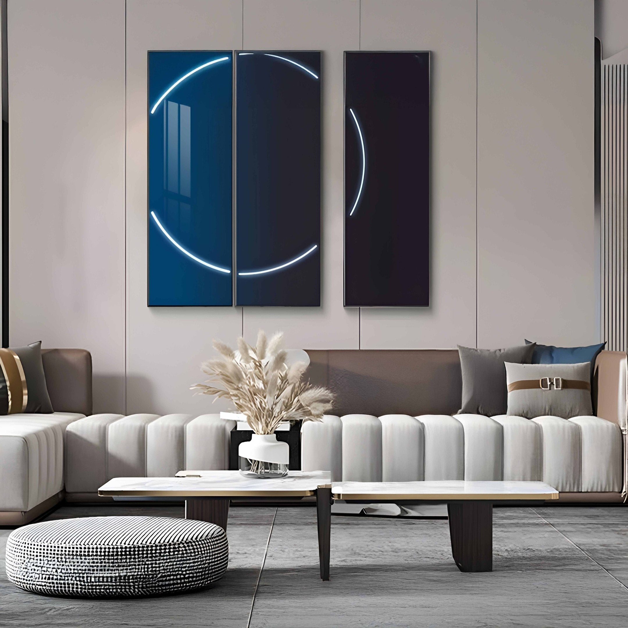 Helios Cobalt Crystal Porcelain LED Wall Art captivates with its deep, oceanic tone that introduces a cool, modern aesthetic to your interior. The three-panel arrangement showcases crystal porcelain in a vibrant cobalt hue, each panel framed by sleek metal for a refined finish. At the heart of this piece lies a circular LED component, glowing softly against the intense blue background to create an engaging visual contrast. This fusion of color and light suits a variety of decor styles, from minimalist to contemporary chic.