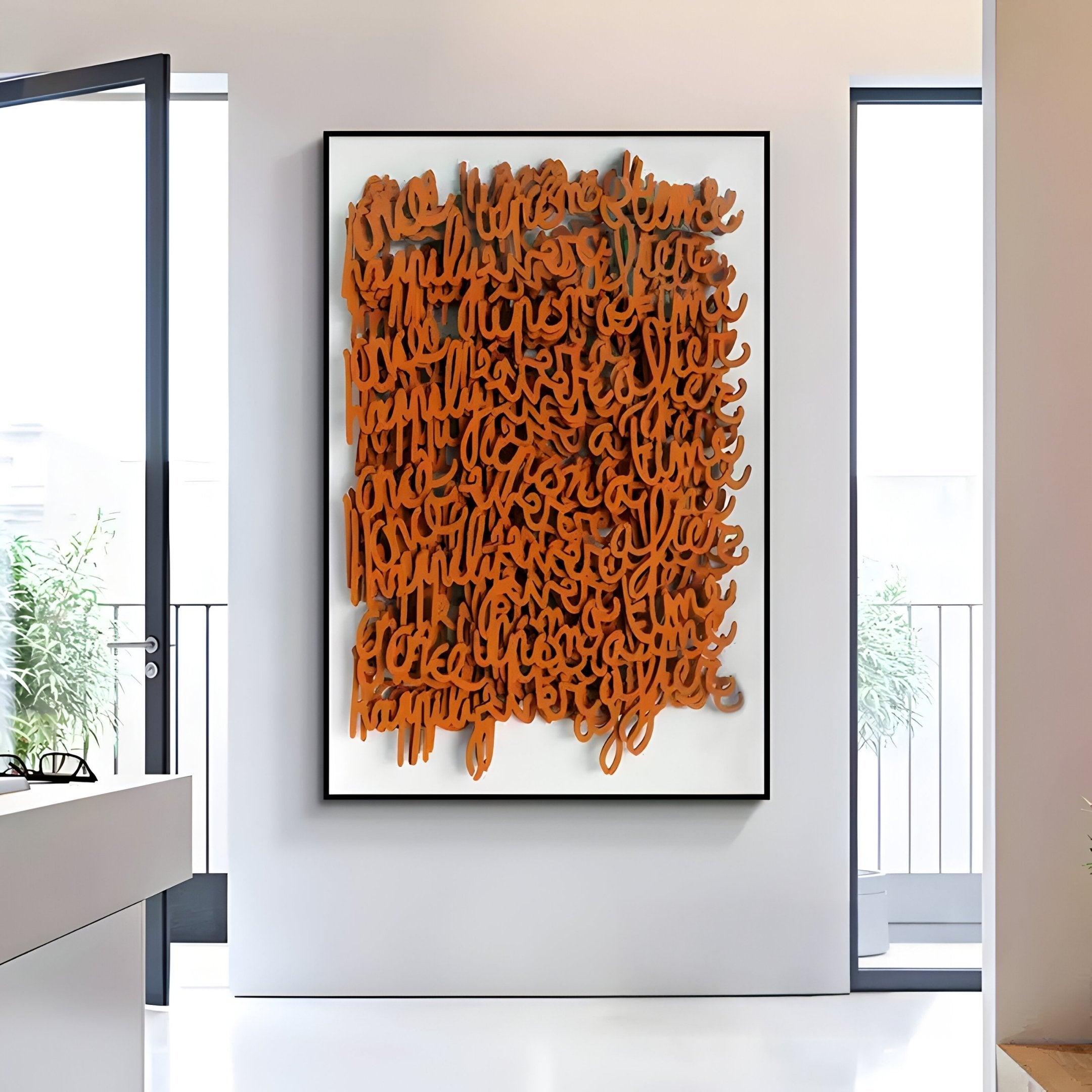 The Oratoria Orange Scripted Wood Carving Hand-Painted 3D Wall Art is a statement piece that combines intricate craftsmanship and bold design. Featuring a layered composition of hand-carved wooden scripts, this artwork creates a textured, three-dimensional visual impact. Its vibrant orange finish adds warmth and energy to the design, making it a striking addition to contemporary interiors. The interplay of carved text shadows enhances its depth and complexity, inviting closer appreciation of its detailed craftsmanship. This piece is perfect for modern living rooms, creative spaces, or office environments, offering an engaging focal point for any wall.