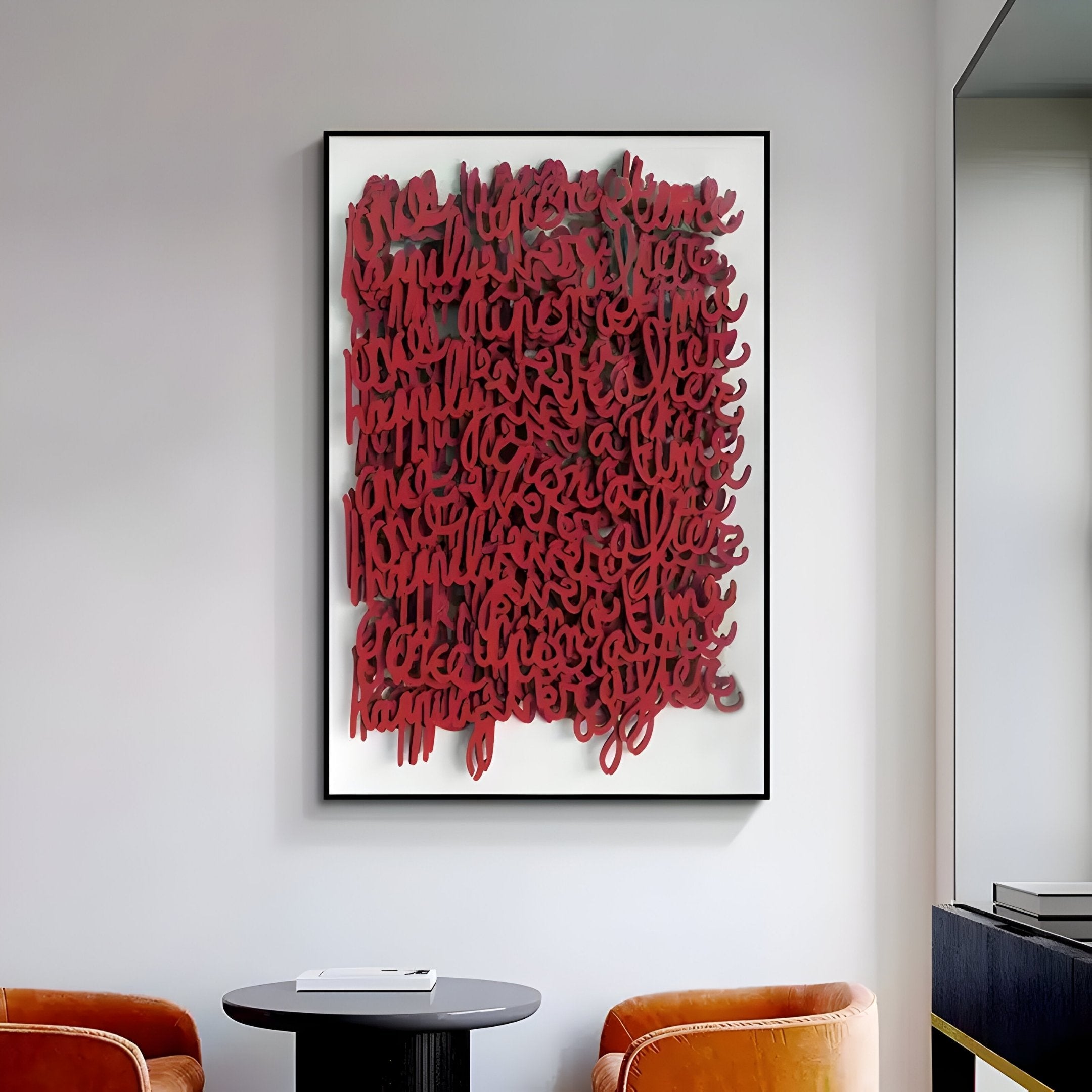 This hand-painted wall art combines the elegance of detailed lettering with the boldness of a red palette. Its layered design creates a sense of movement, inviting a closer look at the precise craftsmanship. The vivid red tone works well in a variety of settings, from industrial and minimalist interiors to more eclectic styles. Whether displayed in a communal area or a personal space, the artwork’s versatility ensures it can adapt to complement its surroundings. Its commanding colour and intricate design establish it as a key element in any room, creating a warm and engaging atmosphere.