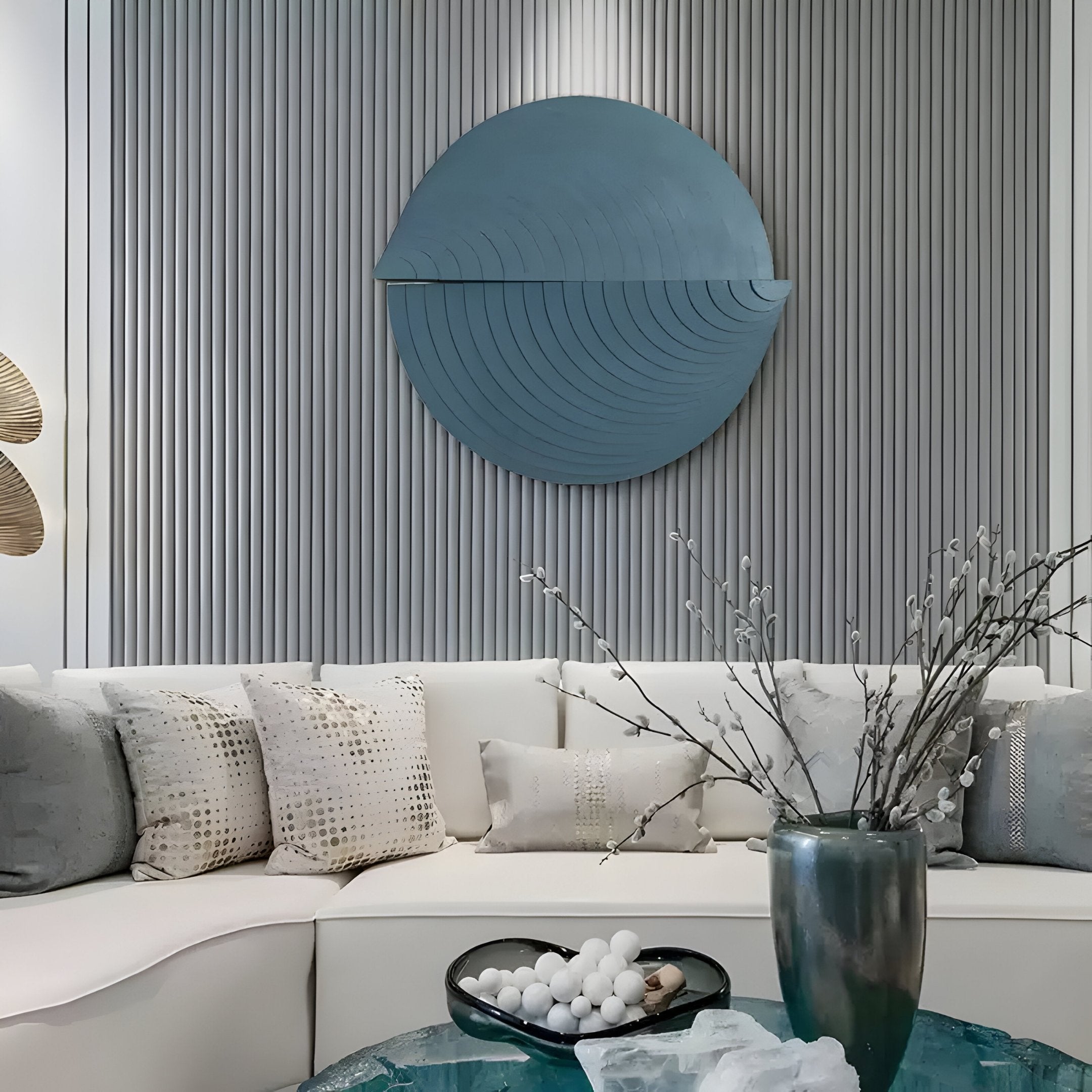 The Orbitals Deep Teal Circular Wood Carved Sandstone 3D Wall Art offers a captivating fusion of form and texture. Featuring concentric carved grooves meticulously sculpted into its circular wooden frame, this piece mimics the appearance of rippling waves or flowing sandstone. The deep teal finish adds a touch of sophistication, blending earthy tones with a bold, modern aesthetic. Perfect for larger wall spaces, this statement piece enhances visual depth and creates a calming focal point. Its smooth curves and layered carvings showcase an interplay of light and shadow that changes with different angles, adding dynamism to any space.