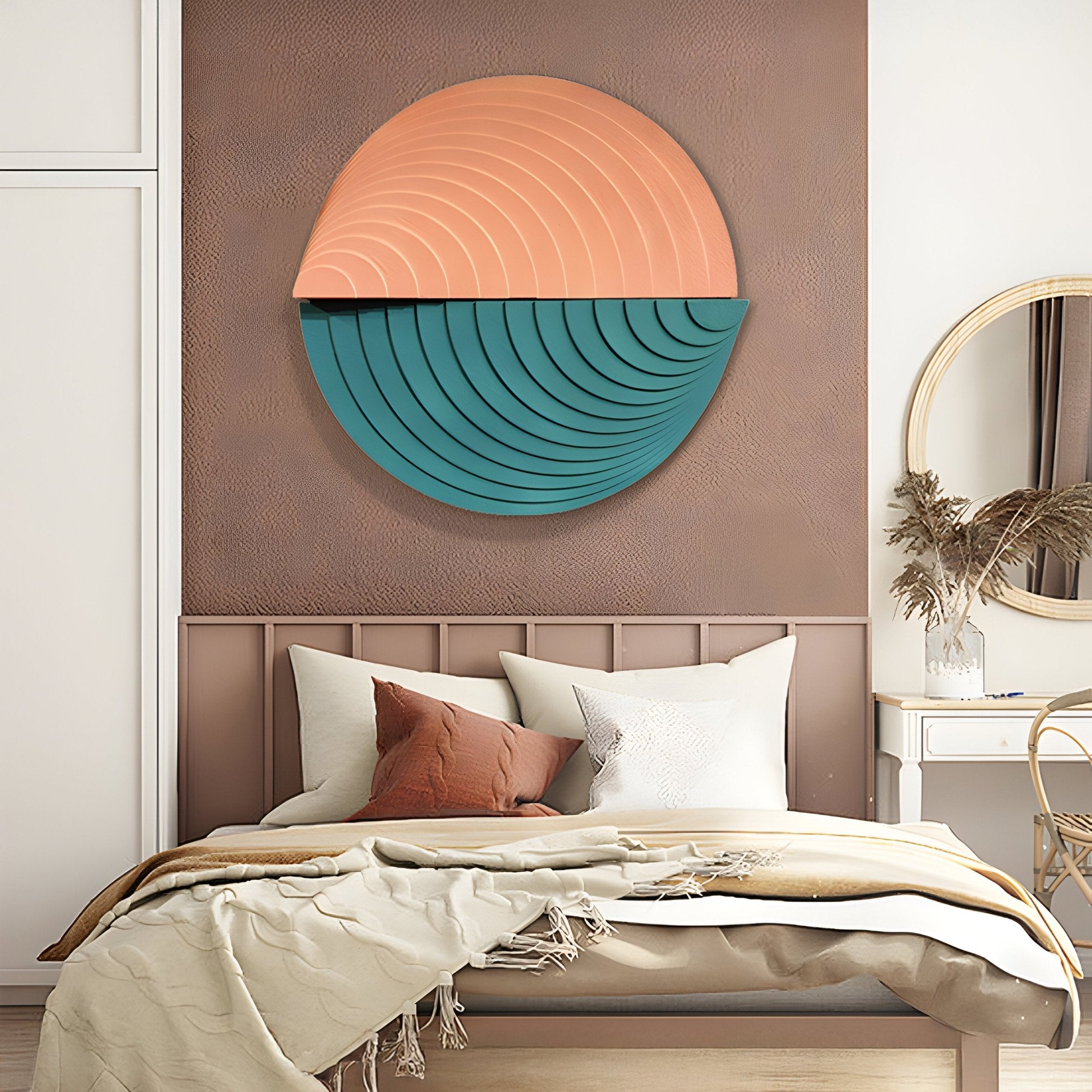 The Orbitals Peach & Teal Circular 3D Wall Art presents a stunning juxtaposition of colours and texture, designed to captivate attention. Handcrafted from carved wood with a sandstone texture, this wall art exhibits a dynamic interplay between a vibrant peach upper half and a calming teal lower half. The precisely etched concentric patterns create a rhythmic flow that adds depth and dimension. With its unique dual-tone finish, this artwork introduces balance and sophistication, effortlessly blending into modern interiors. Whether adorning a bedroom, living space, or a workspace, it serves as a creative focal point, bringing a harmonious touch to the room.