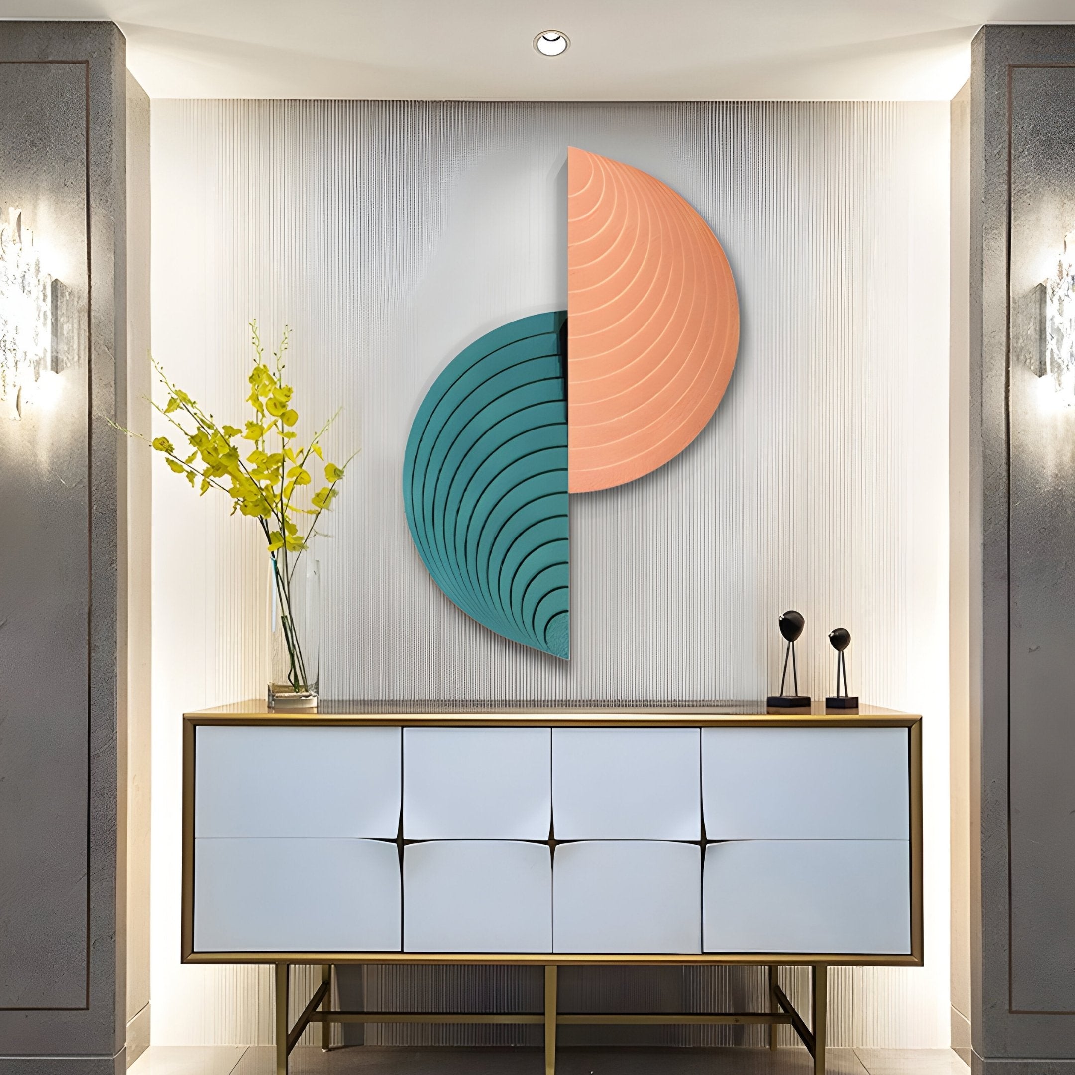 This semi-circle wall art blends two distinct hues - peach and teal, into a visually striking piece that balances symmetry and contrast. Crafted from wood with a sandstone finish, it showcases carved concentric patterns that create a rippling effect, adding texture and dimension to any space. The peach tone brings warmth, while the teal offers a cool counterpoint, making this piece a perfect fusion of modern design elements. Its compact size and versatile shape allow it to be displayed either horizontally or vertically, offering flexibility to suit various settings.
