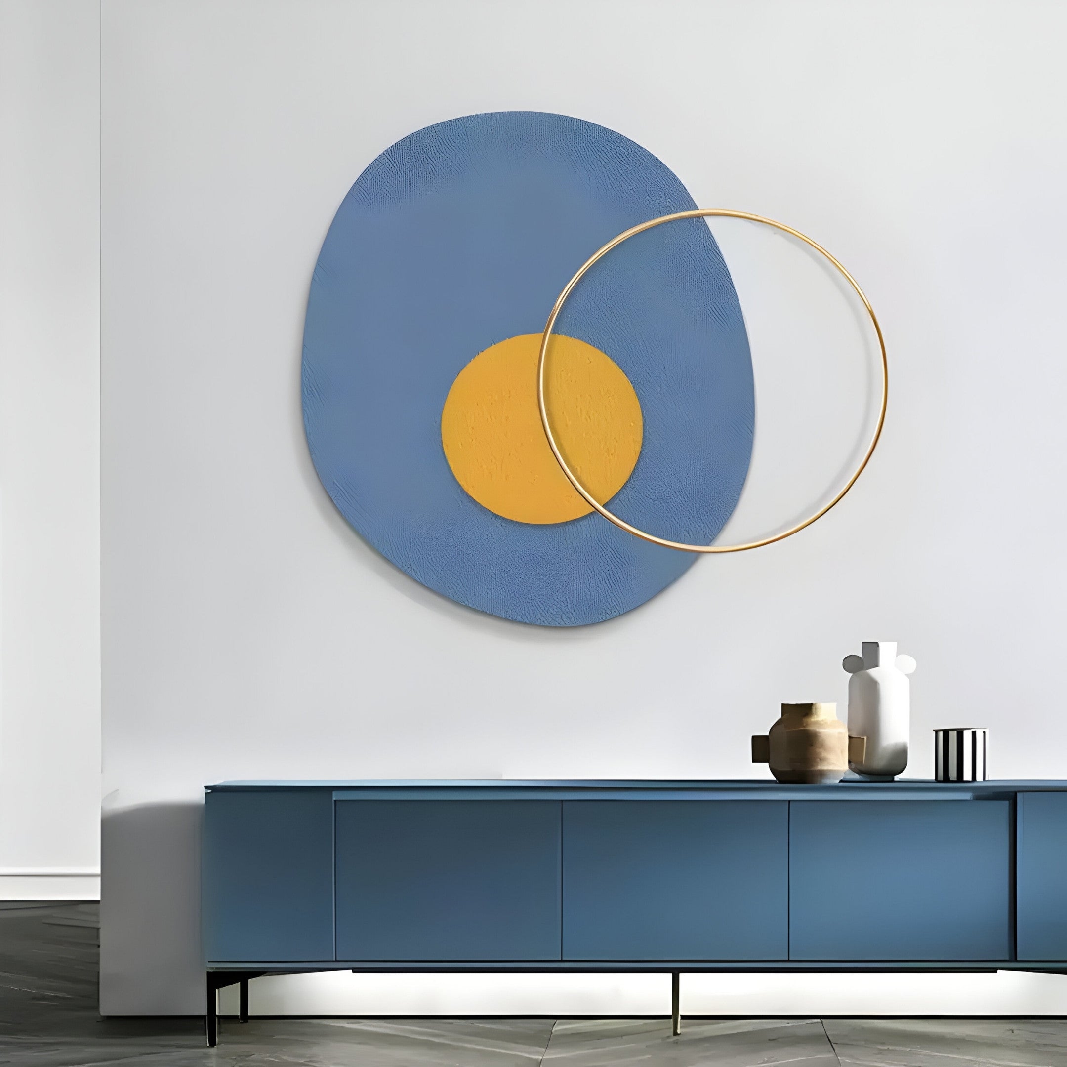 This stunning wall art combines vibrant blue and cheerful yellow hues, brought together by its smooth, sandstone-textured surface and accented with a sleek golden ring. The design is a harmonious blend of geometric forms, featuring a round yellow centre against the larger blue backdrop, creating a visual contrast that is both calming and energizing. Handcrafted with care, this Nordic-inspired art piece is perfect for those looking to introduce a touch of minimalism and warmth into their interiors. The subtle texture adds depth to the piece, making it an eye-catching addition to any space.