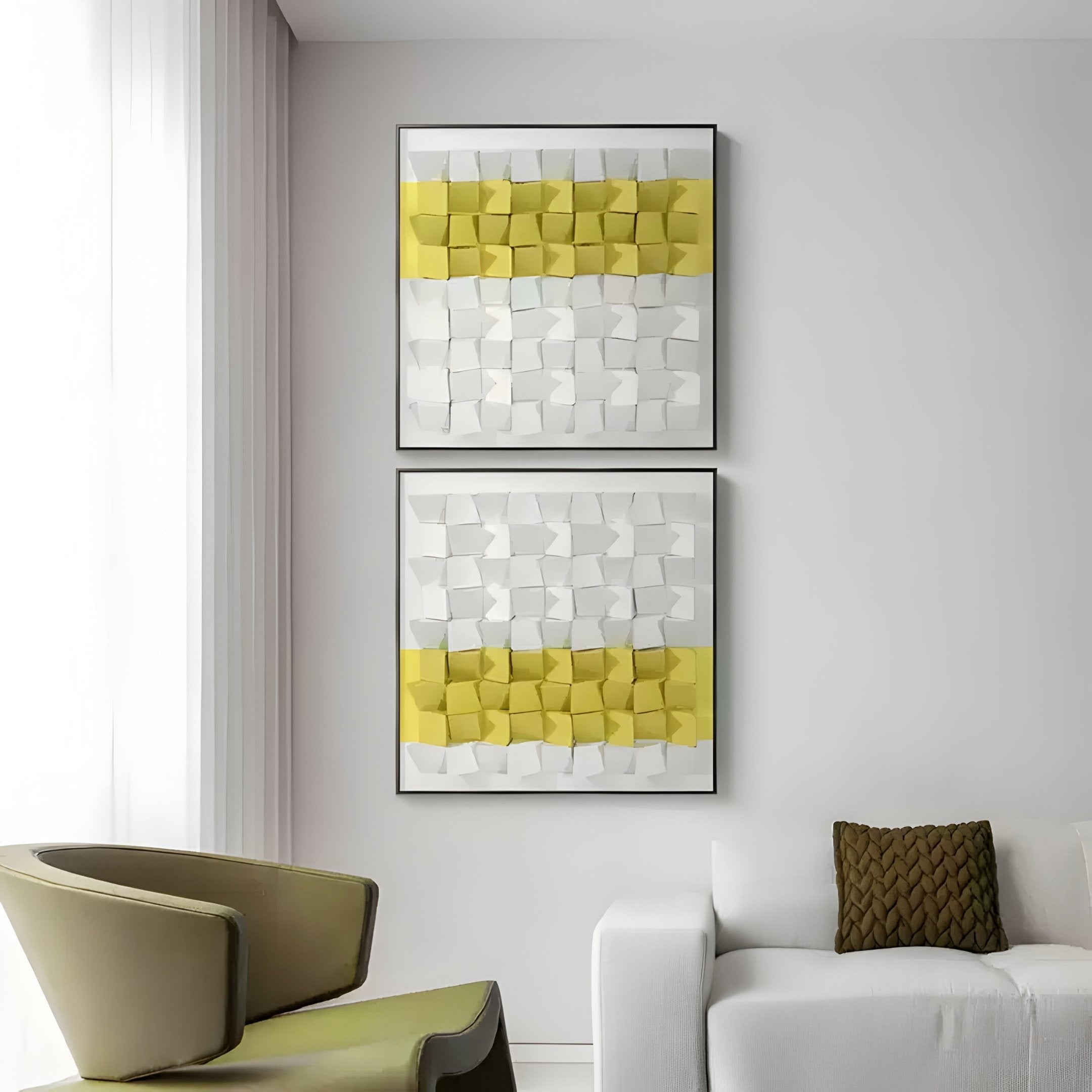 The Tessera White & Yellow I Geometric Wood 3D Wall Art presents a striking fusion of clean geometry and bold colour. Crafted from hand-painted pine wood, this piece features a grid of three-dimensional white blocks accented by a vibrant yellow stripe running across the top section. The dynamic design is enhanced by the interplay of light and shadow on the angled surfaces, giving the artwork a sense of depth and movement. Framed in a durable aluminium alloy, this contemporary piece combines artistic sophistication with practical durability.