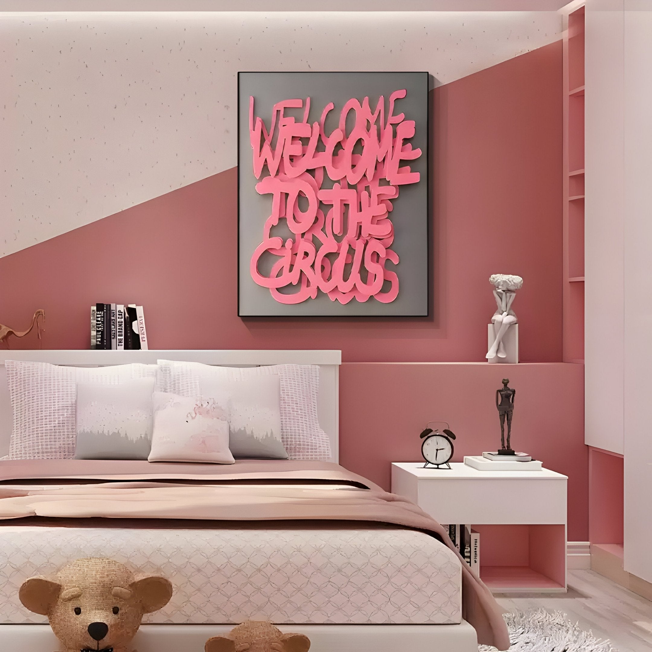 The Urbanic Pink Welcome Script 3D Wooden Graffiti Wall Art is a vibrant and contemporary piece that captures the energy of urban aesthetics. Featuring the bold phrase 'Welcome to the Circus' in a lively graffiti-inspired font, this wall art is meticulously carved from premium wood and finished with a striking pink hue. The layered 3D design adds depth and visual intrigue, making it a standout addition to any space. Set against a muted grey backdrop, the vivid pink script creates a dynamic contrast that draws attention while maintaining a sense of modern balance.