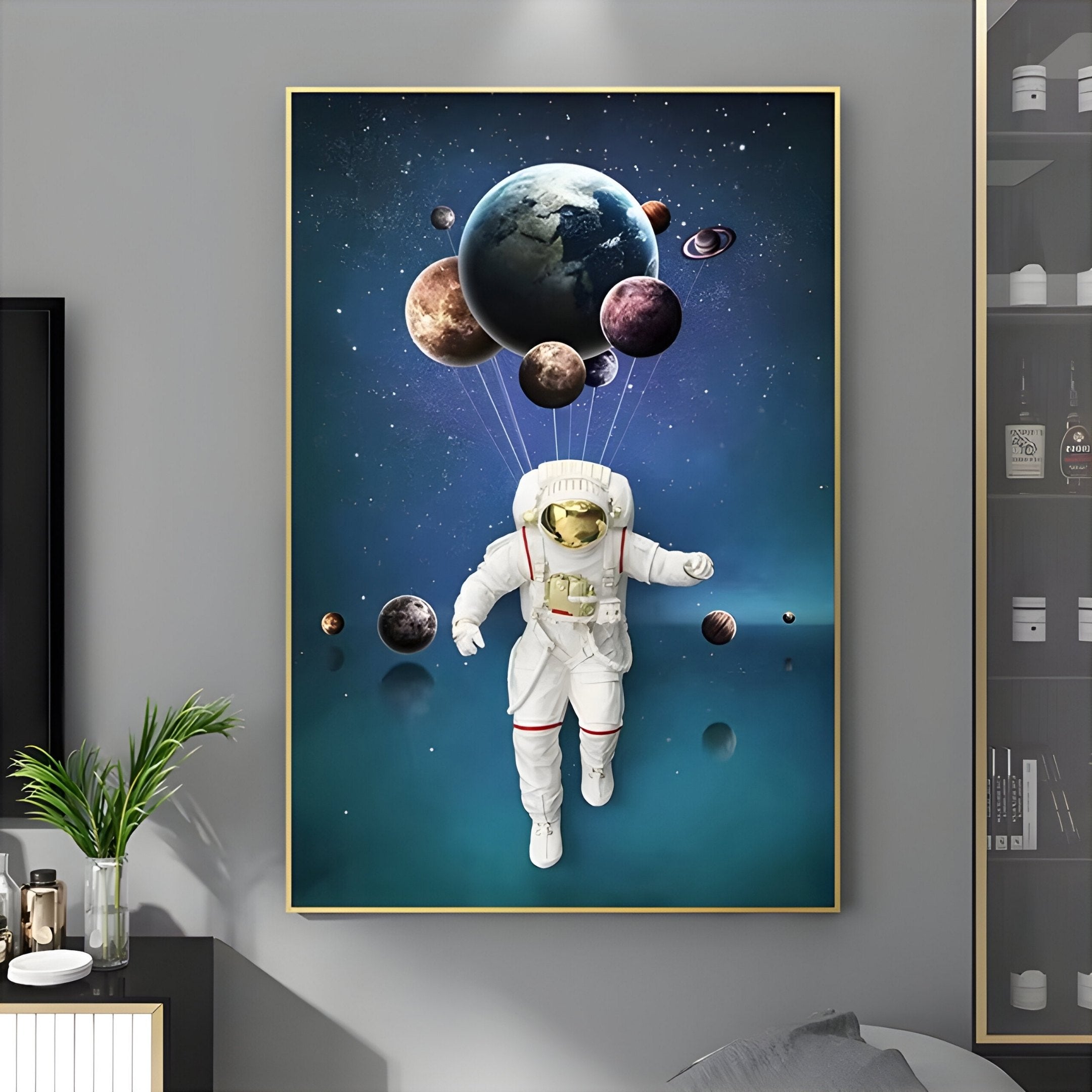Bring an otherworldly touch to your décor with the White 3D Space Astronaut Planet Balloons Wall Art, a scene that fuses imagination with cosmic wonder. In the foreground, a white-suited astronaut appears to float gracefully, clutching multiple planet-shaped balloons that evoke the vastness of our solar system. A golden visor draws the eye, reflecting light and highlighting the astronaut’s sense of adventure. The deep, star-speckled background contrasts with the astronaut’s crisp suit, creating a dynamic interplay of colour and space. Earth, Saturn, and other celestial spheres hover overhead, suggesting boundless exploration and inviting you to ponder distant worlds. Whether placed in a living room, bedroom, or creative workspace, this wall art sparks conversation and captures the thrill of venturing beyond our familiar horizon.