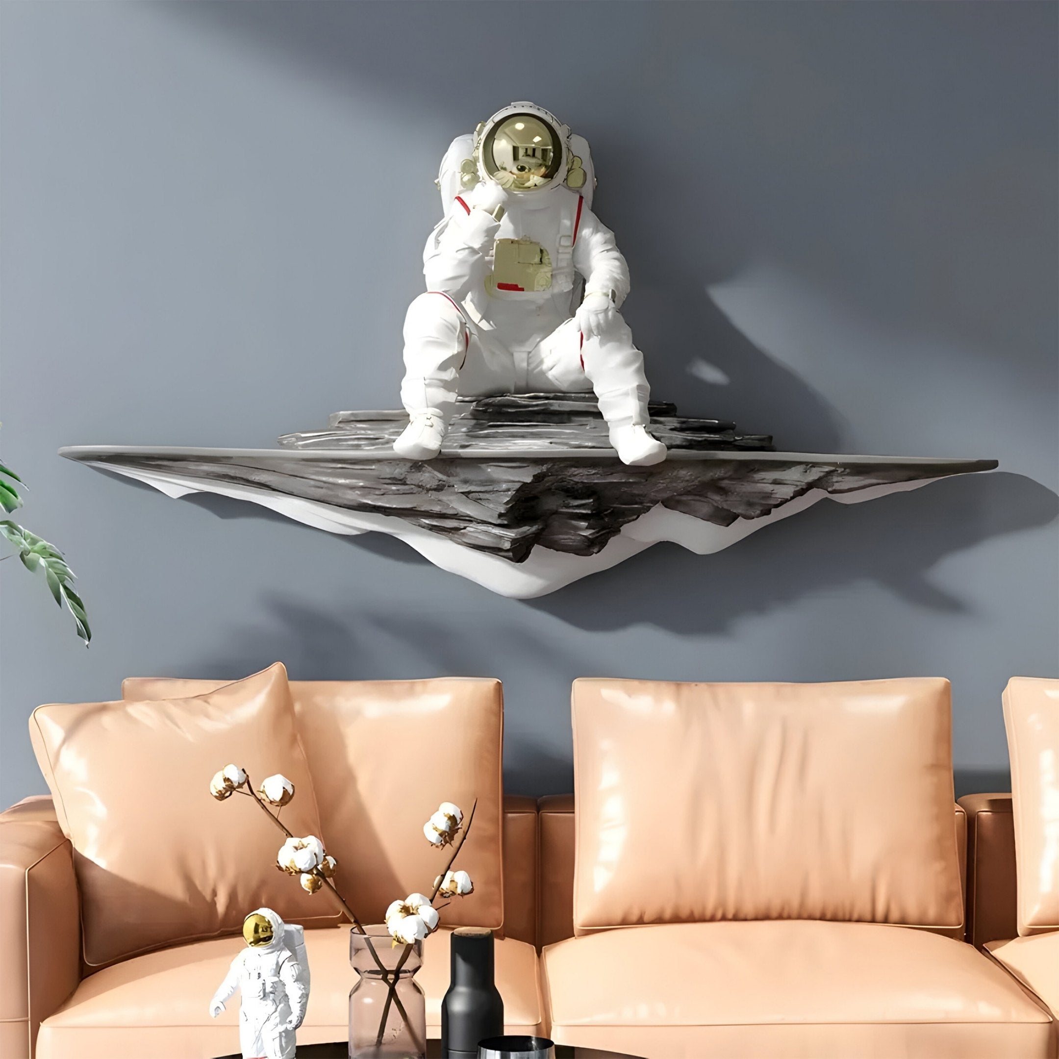 Add a contemplative cosmic touch to your décor with the White Astronaut Thinker On Rocky Shelf 3D Wall Art, a resin sculpture that blends imaginative design with a hint of futuristic wonder. Dressed in a crisp white spacesuit accented by subtle red lines, the astronaut rests on a rocky grey shelf as though pausing to survey uncharted horizons. A gold visor adds a warm contrast to the white suit, reflecting surrounding light and drawing attention to the figure’s thoughtful stance. This piece transforms any lounge, office, or bedroom wall into a focal point that sparks conversation about exploration and the mysteries of outer space.