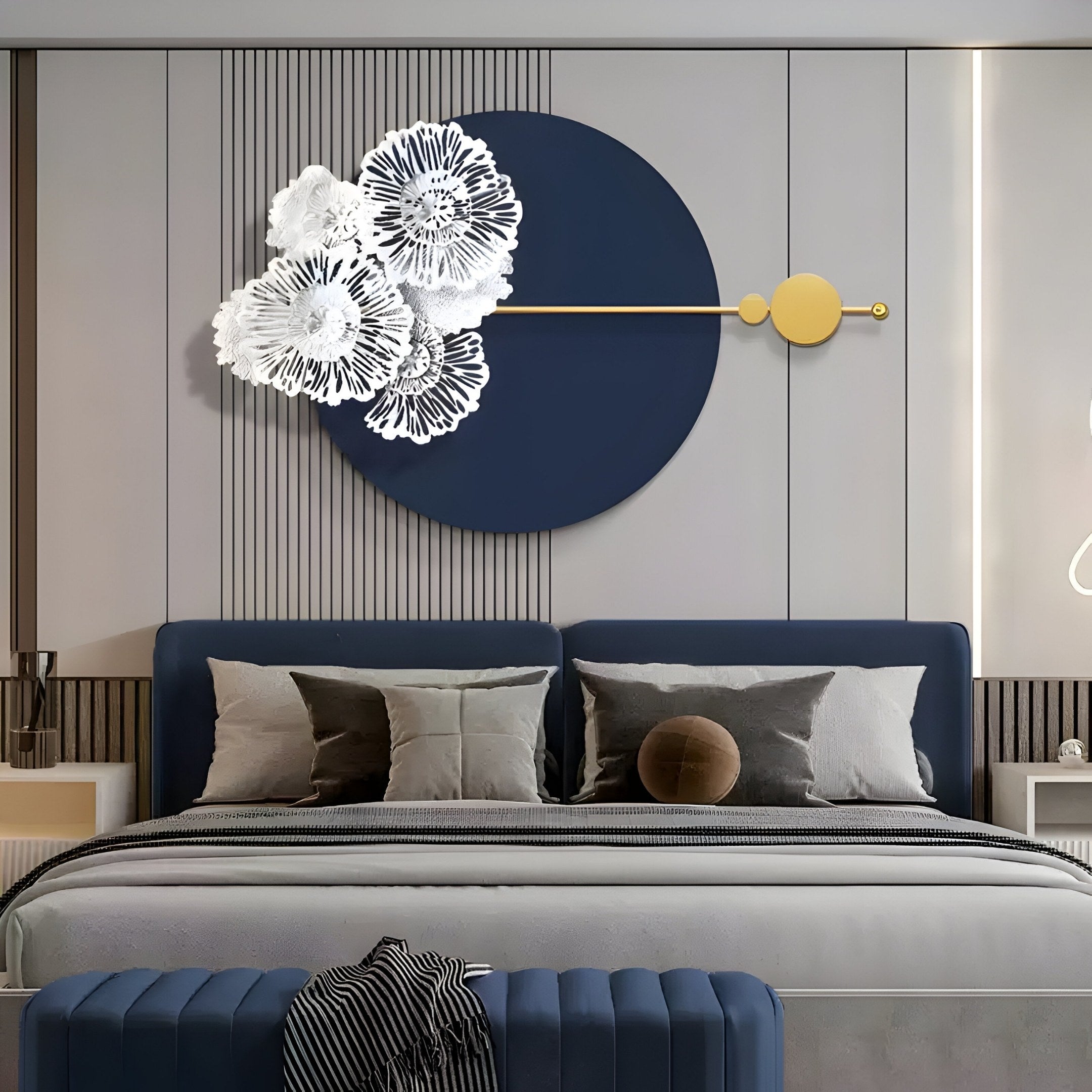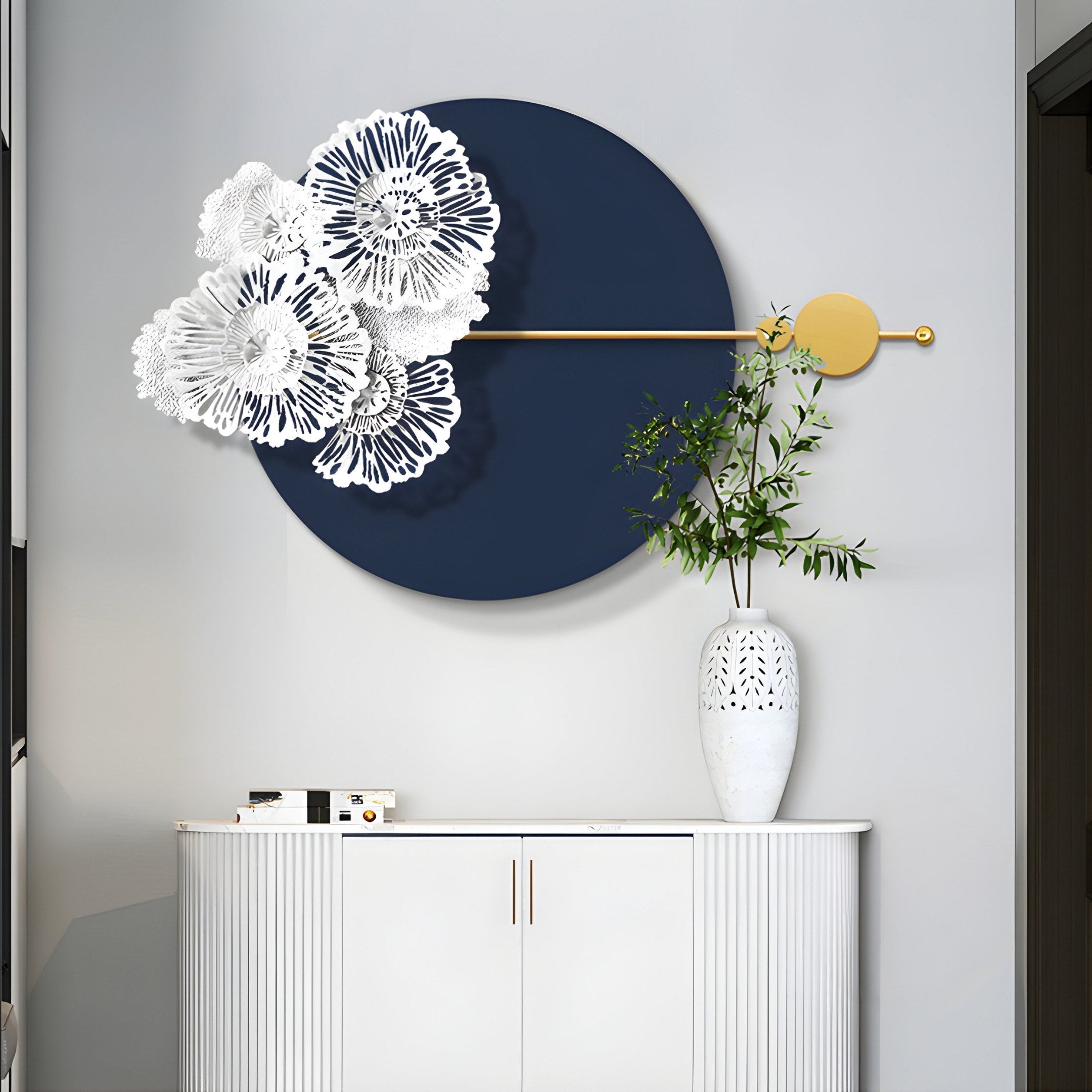 Designed to enhance versatility, this floral round wall art fits seamlessly into living rooms, bedrooms, hallways, or dining areas. Its refined design and harmonious colours make it ideal for modern interiors, whether displayed above a sofa, bed, or entryway. The blend of midnight blue, white, and gold brings an artistic and calming balance to both residential and upscale commercial settings, elevating the mood wherever it’s placed.