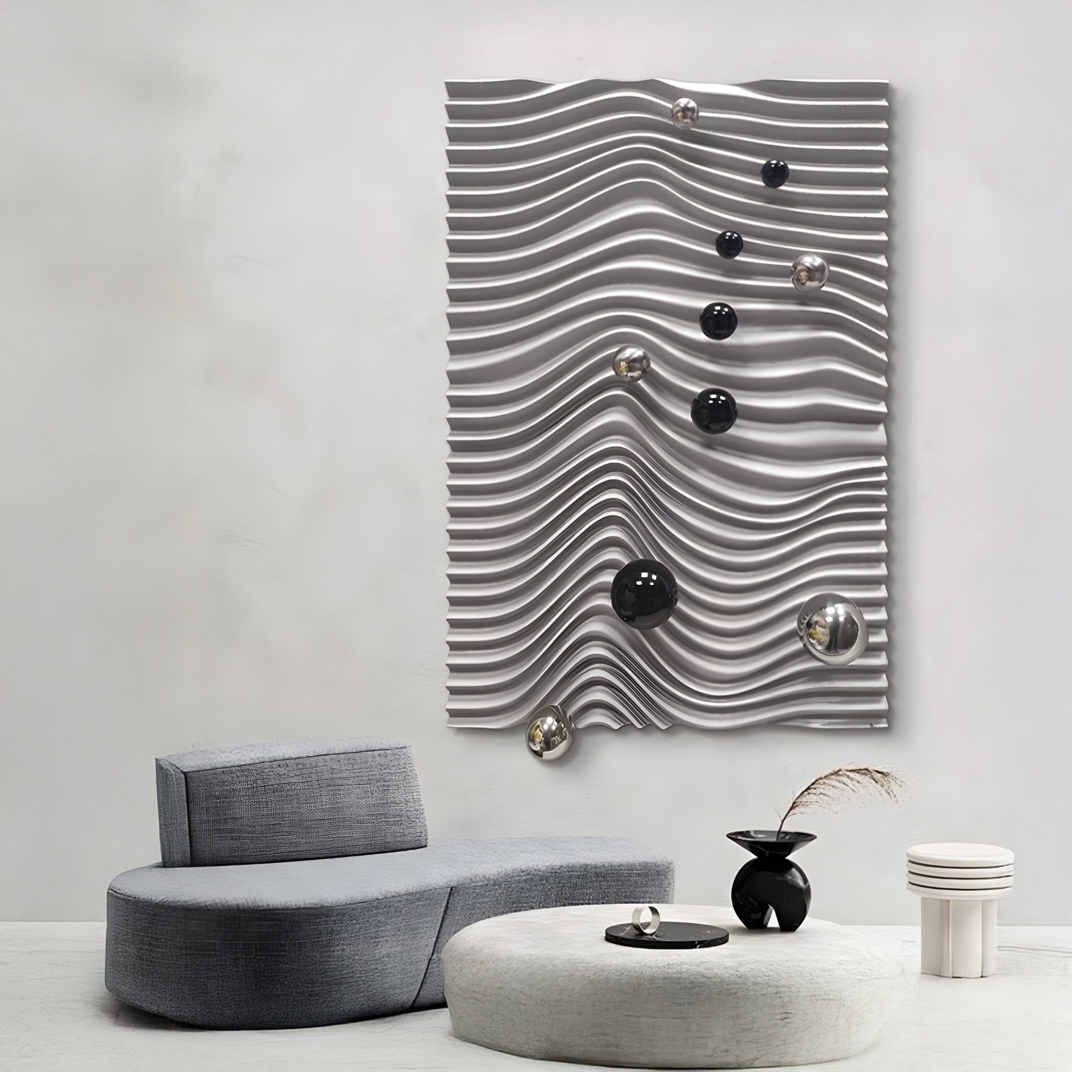 Composed of smooth, flowing ridges and ornamental spheres, the Calidora Wave Sculpted Textured 3D Relief Wall Art introduces a dynamic and modern touch to upscale interiors. Undulating horizontal lines dominate the wooden panel, creating a visual rhythm reminiscent of gentle waves. Some ridges are adorned with contrasting spheres in metallic shades, forming pockets of shine against a matte, sculpted backdrop. Whether placed in a corridor, entrance hall, or living area, this piece stands out for its interplay of reflection and texture. The fluid lines evoke movement, while the glossy orbs add a dash of luxury, making it ideal for modern or light-luxury aesthetics.