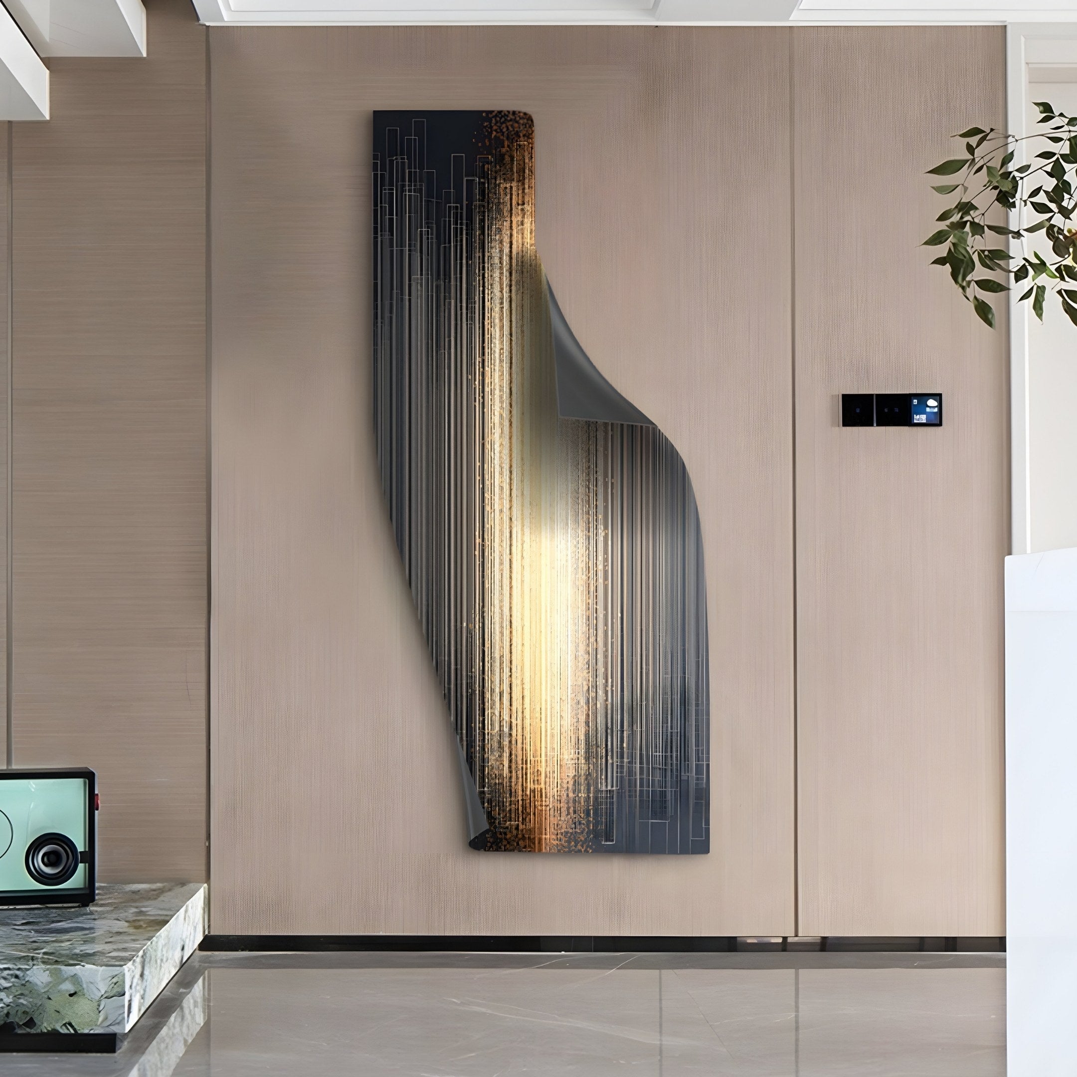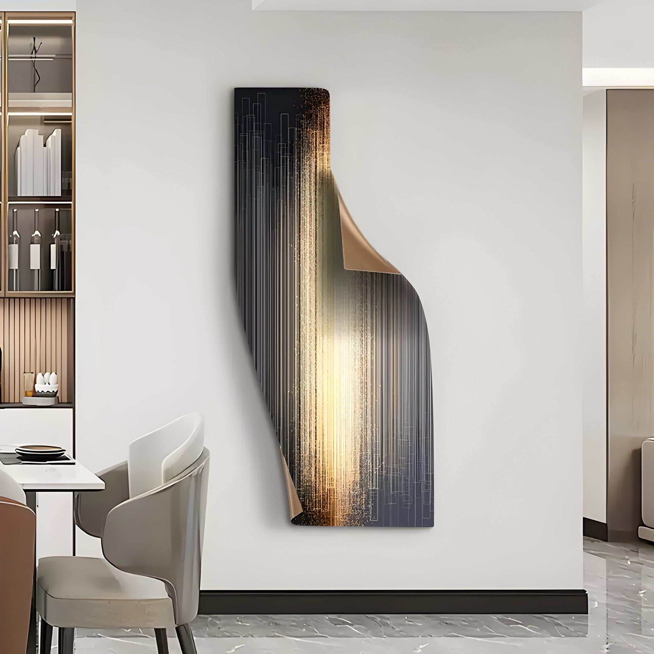 Crafted with precision, the Celestial Gold Radiance Curved Angled Abstract Metal Wall Art combines flowing forms with dynamic golden accents. The intricate vertical lines cascade like streams of light, contrasting beautifully against the matte black surface. Its unique curved shape, accented with brushed bronze folds, gives it a sophisticated, layered appearance. This 3D piece showcases a striking interplay of light and shadow, creating a captivating focal point wherever it’s placed. Made from high-quality stainless steel, it ensures durability while exuding an upscale aesthetic.