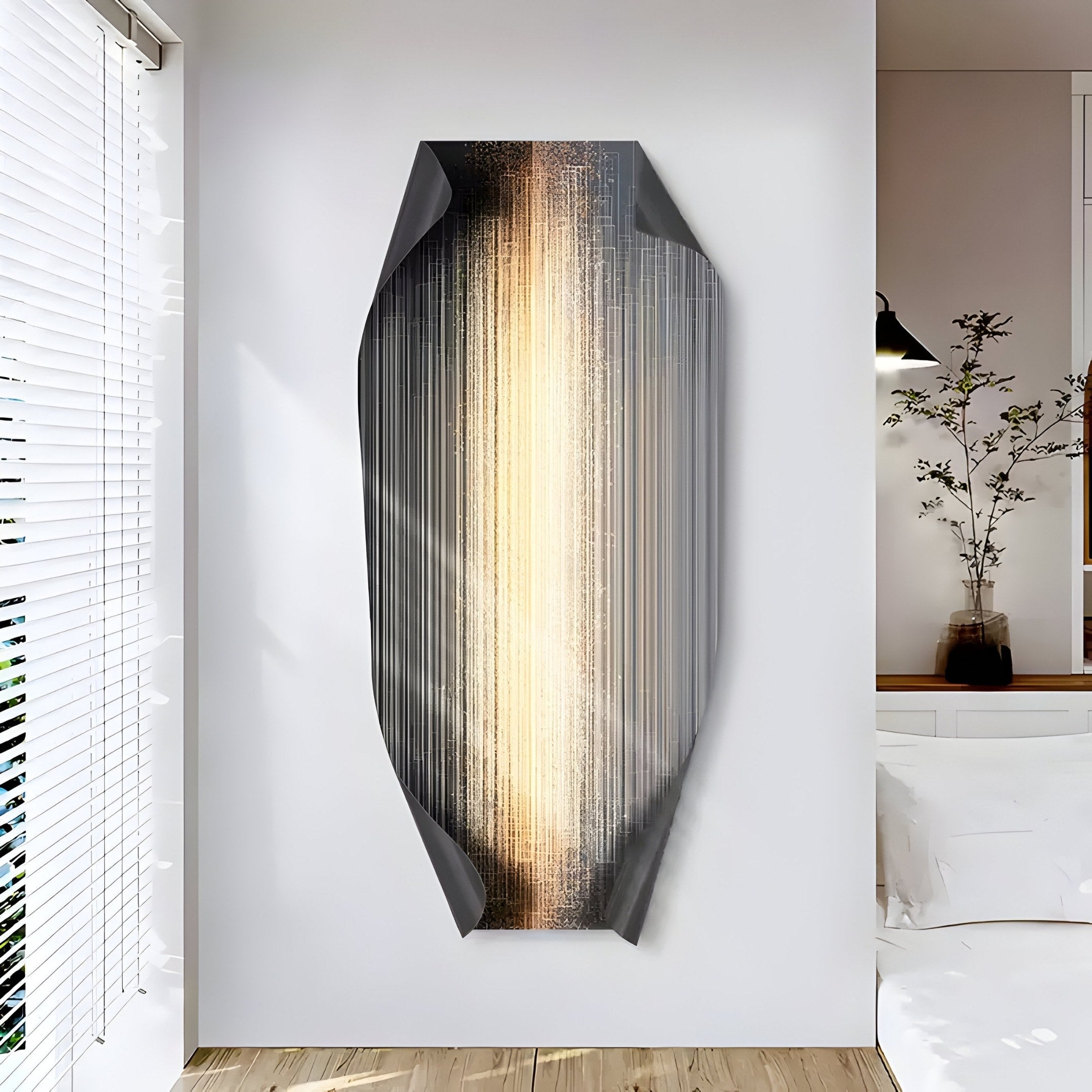 Celestial Gold Radiance Edge Folded Abstract Metal Wall Art brings a dynamic touch of contemporary elegance to any interior. This artwork features a striking gold vertical gradient, intricately detailed with linear precision, creating a glowing, radiant effect. Its curved edges and folded accents give it a sculptural quality, making it stand out as a sophisticated focal point. The interplay of matte black and shimmering gold hues adds dimension and visual interest, perfect for upscale modern interiors.