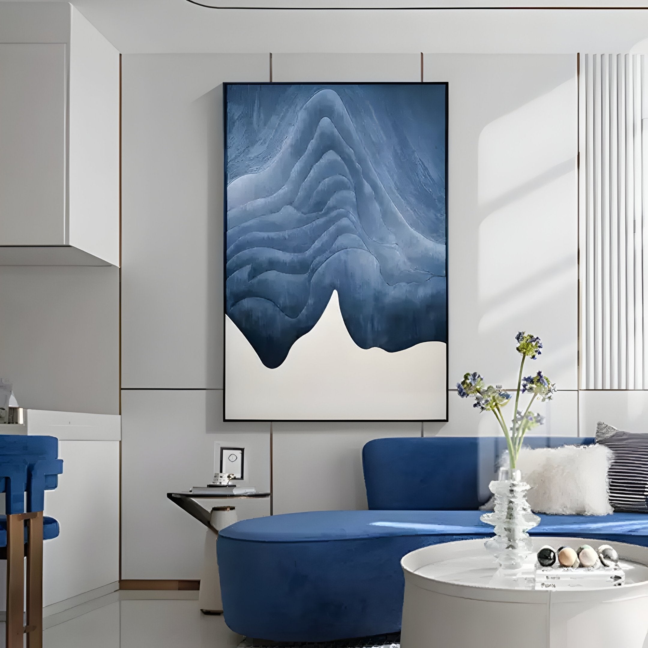 The Celoria Azure Tide Wood Carving 3D Wall Art brings sculptural motion and cool-toned calm to indoor spaces. Crafted from carved wood and hand-painted in rich blue gradients, this vertical piece echoes the natural rise and fall of tides or distant coastal ranges. Carved in layered ridgelines, the form captures the rhythm of flowing water, moving from inky navy to pale storm blue before fading into a crisp, clean white base. The textures cast natural shadows and invite light to move softly across the surface throughout the day. With its combination of depth and restraint, it anchors the room without overpowering it.