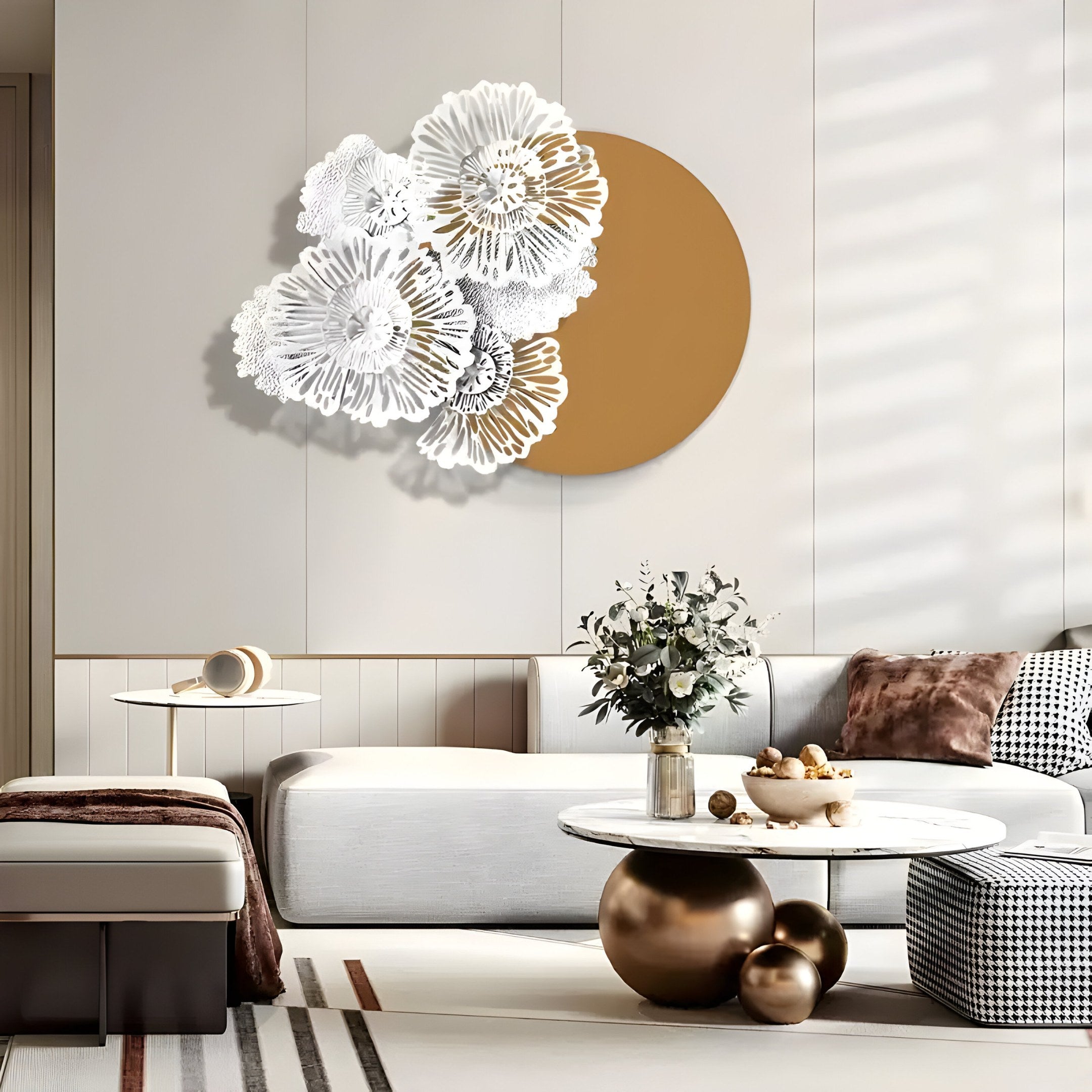 The Fleur Halo Mustard Round White Metal Floral Decorative Wall Art brings a harmonious blend of modern design and natural charm. It features an intricately arranged cluster of white iron flowers, expertly crafted with fine detailing to create a textured, three-dimensional effect. The flowers are set against a bold mustard round backdrop, adding a warm contrast to the crisp white petals. The balanced composition brings together geometric structure and organic beauty, making it a standout piece in any room.