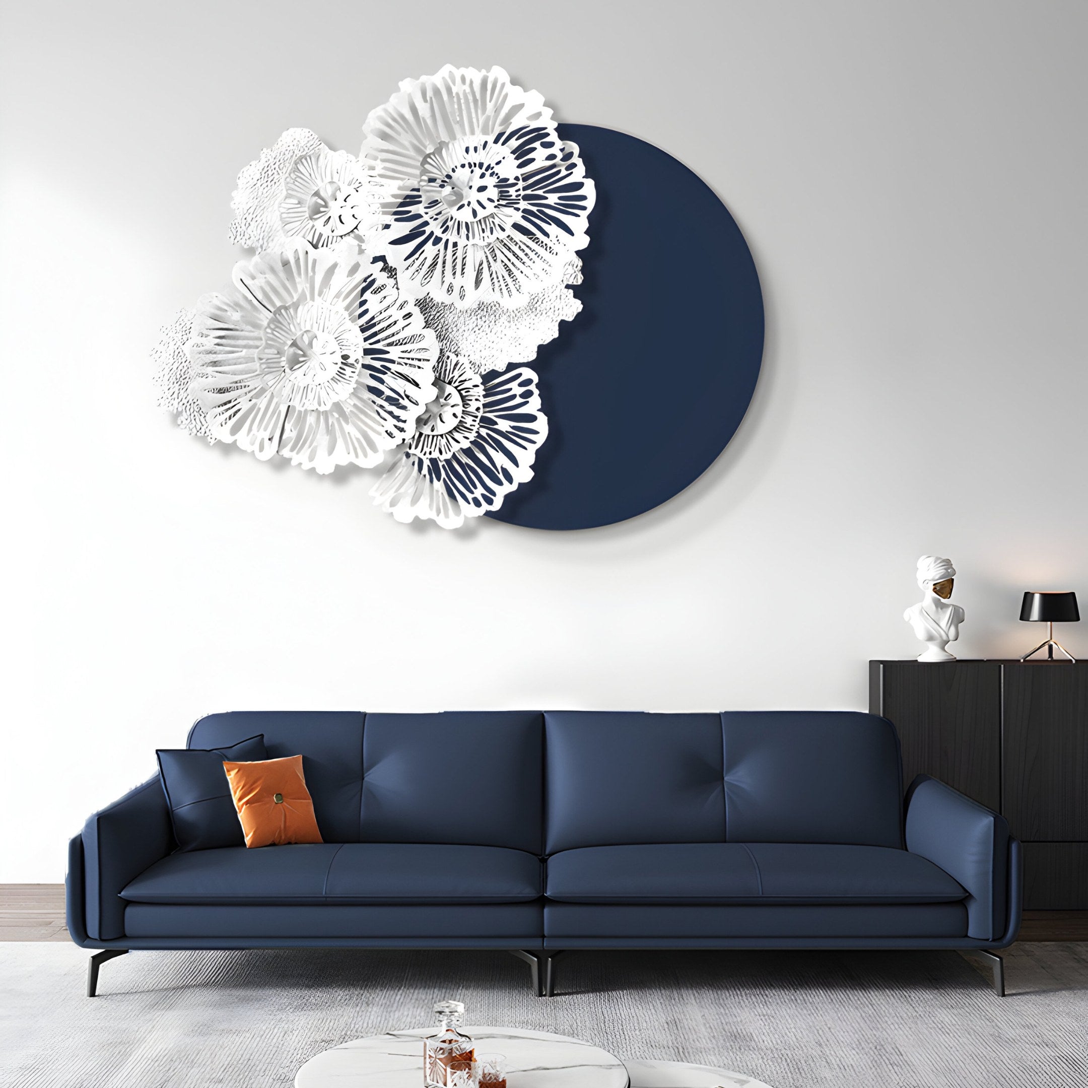 Fleur Halo Navy Blue Round White Metal Floral Decorative Wall Art blends artistry and sophistication with its bold navy blue backdrop and intricate white floral arrangement. This piece features delicately crafted metal flowers that showcase exceptional detailing, creating a textured, three-dimensional look. The deep navy circle contrasts beautifully with the bright white floral patterns, making this wall art a striking focal point in any room. Its modern appeal is enhanced by its clean design, while the floral motif brings a sense of natural beauty to your space.