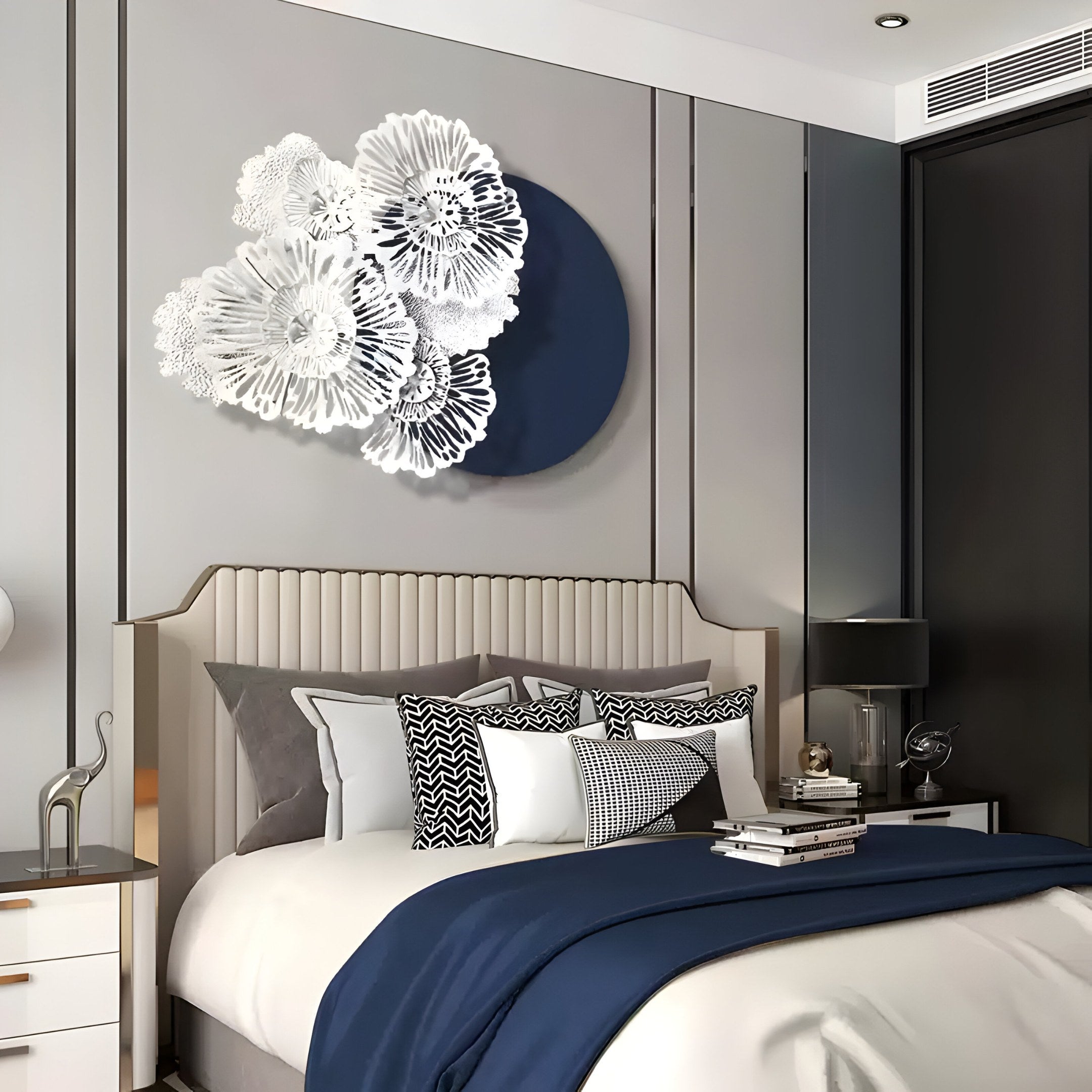 This navy blue round wall art brings artistic charm and balance to contemporary spaces. The detailed white flowers pop against the rich navy background, offering an eye-catching contrast perfect for living rooms, bedrooms, or hallways. Its versatile design complements a range of interior styles, from minimalist modern to classic decor, adding texture and visual interest wherever placed. The Fleur Halo Wall Art is crafted with precision using durable iron material, ensuring its longevity and quality. Ideal for indoor spaces, this piece works beautifully as an accent over beds, sofas, or dining room walls. Its lightweight design makes it easy to hang and reposition, allowing you to refresh your space with minimal effort. Add this elegant floral wall art to your home for a blend of contemporary style and timeless charm.