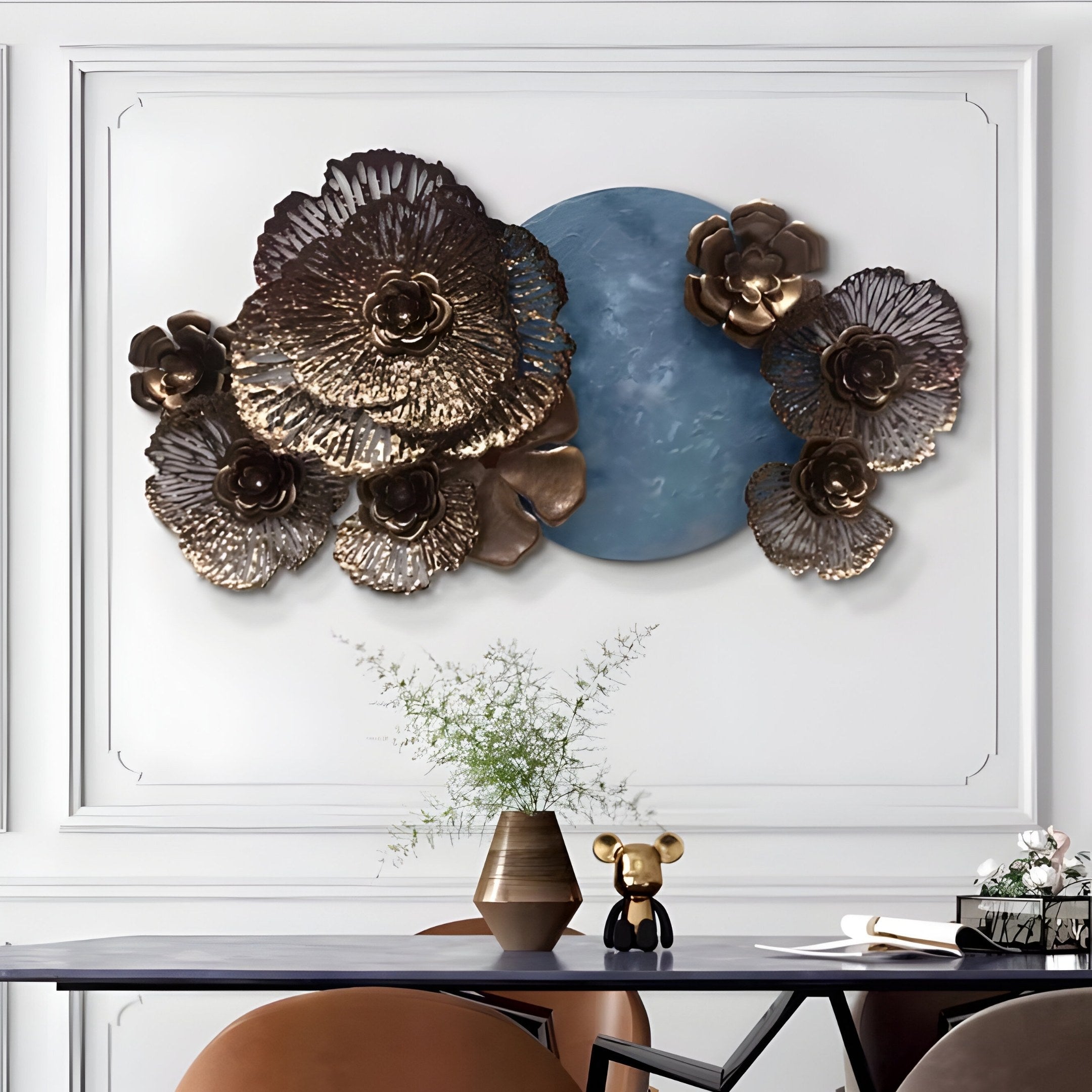 The Luminis Bloom Blue Floral Metal Wall Art is an elegant blend of hand-crafted metal flowers and a serene blue circular base. Each floral detail features a mix of metallic gold and bronze tones, adding texture and dimension to the design. The hand-painted blue backdrop brings balance and calm, perfectly complementing the intricate metallic flowers. Its three-dimensional structure showcases thoughtful craftsmanship, creating an eye-catching statement piece for any wall.