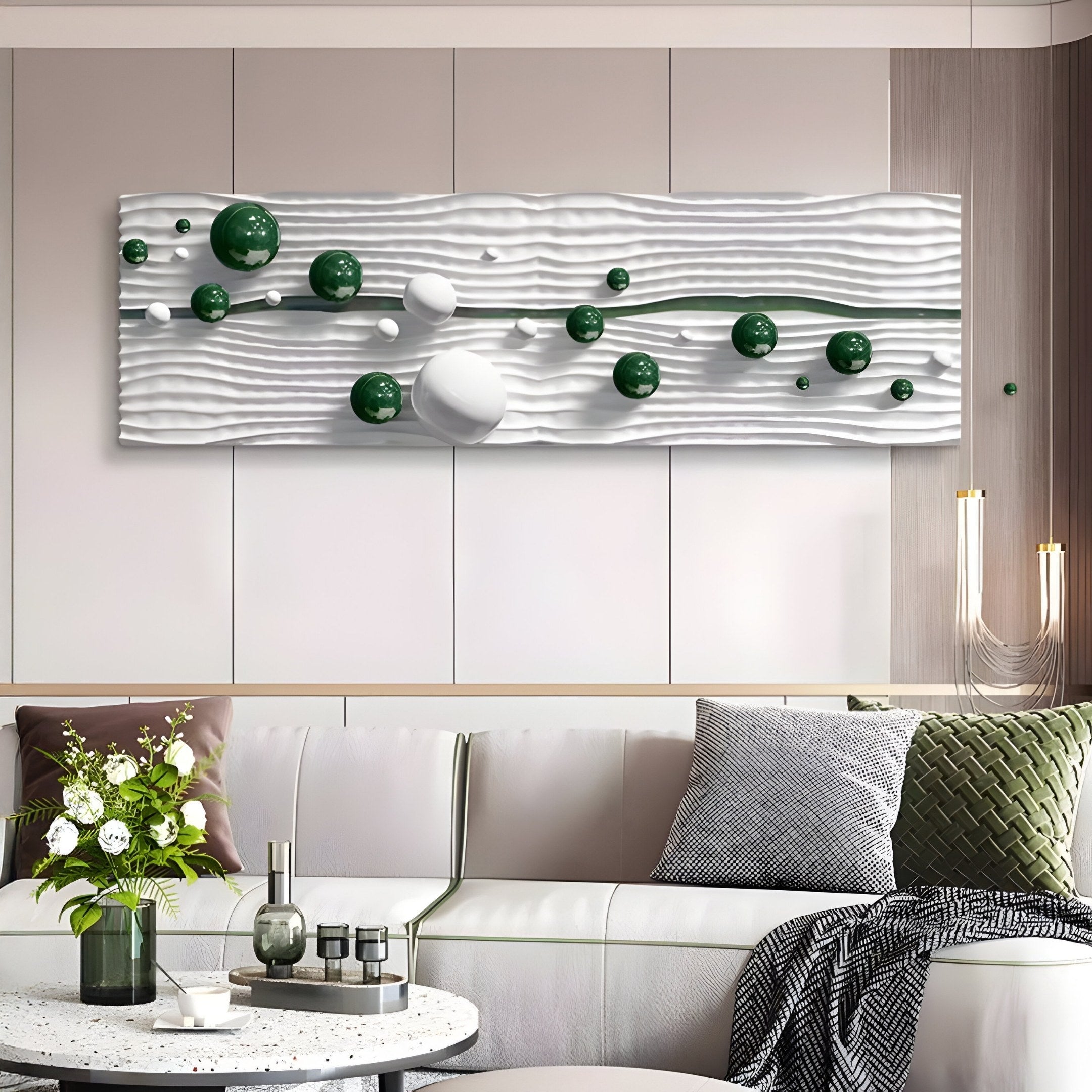 Wave-like ridges span the Lustra Green & White 3D Wood Relief Wall Art With Metal Ball, creating a sense of gentle movement across a wide horizontal panel. Carved into solid wood and treated with a textured finish, each contour reflects light at varying angles, adding depth to the piece. A slim green band stretches along the centre, guiding the eye from one side to the other. Glossy spheres in matching green and bright white appear in different sizes, introducing a playful mix of shapes. Their smooth surfaces contrast the rippled background, and a protective layer helps preserve the clarity of both the white surface and the vivid green elements.