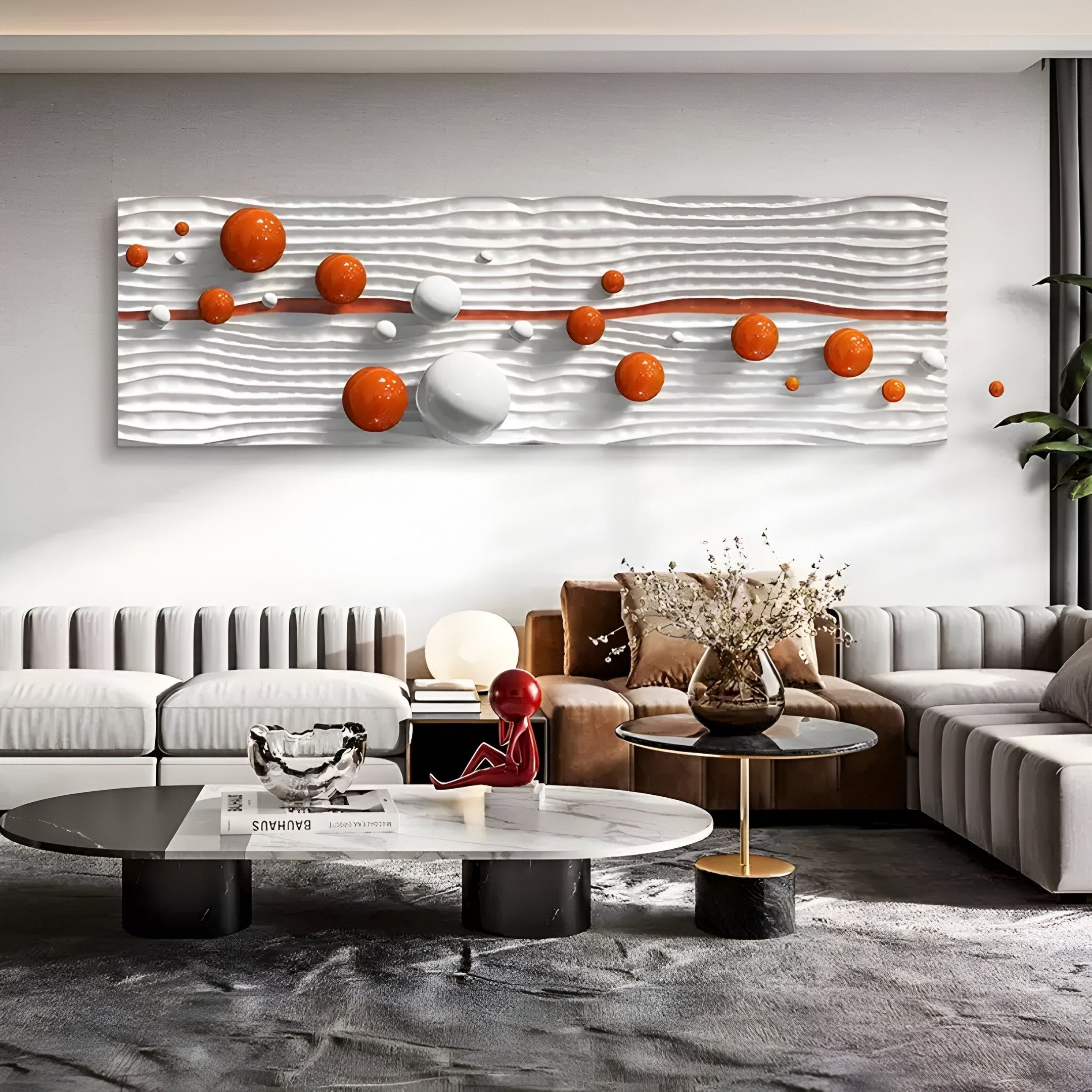 Ideal for above a sofa, console table, or bed, this elongated piece provides a focal point that stands out without overwhelming a room. The orange orbs add a warm pop of colour against the understated white surface, while the scattered spheres evoke a sense of movement. Thanks to sturdy construction, the Lustra Orange & White 3D Wood Relief Wall Art With Metal Ball withstands everyday conditions, retaining its sculptural appeal. The combination of flowing ridges and polished spheres suits a variety of interior styles, from modern to transitional. By merging calm wave-like patterns with bursts of orange, this artwork creates a balanced statement that sparks conversation and invites a second look. Its restrained palette underscores the interplay of shape and shine, resulting in a piece that enhances a room’s ambience without overshadowing other elements.