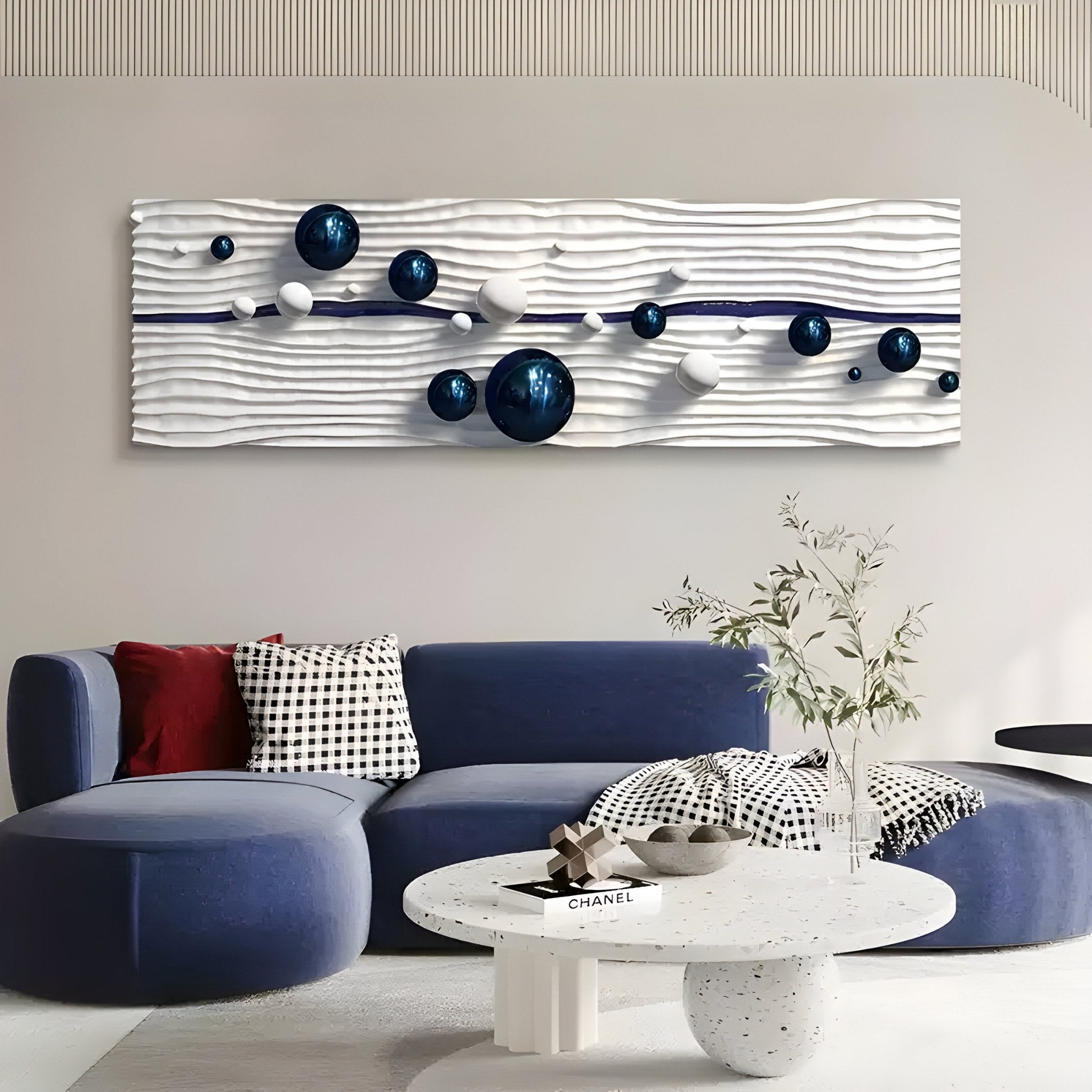 Ideal for living rooms, hallways, or reception areas, this elongated piece adds visual interest without dominating a space. The sapphire-blue spheres bring a touch of richness against the otherwise understated backdrop, while the scattered orbs suggest a sense of movement. Sturdy craftsmanship helps the Lustra Sapphire Blue & White 3D Wood Relief Wall Art With Metal Ball maintain its sculptural appeal through daily use. By blending softly flowing contours with bold colour highlights, the piece adapts well to various interior styles, from modern to transitional. Its balanced design allows the wave patterns and reflective spheres to shine, offering a focal point that sparks conversation. With a controlled palette of white and blue, the artwork emphasises shape and texture, resulting in a composition that complements existing décor without overwhelming it.