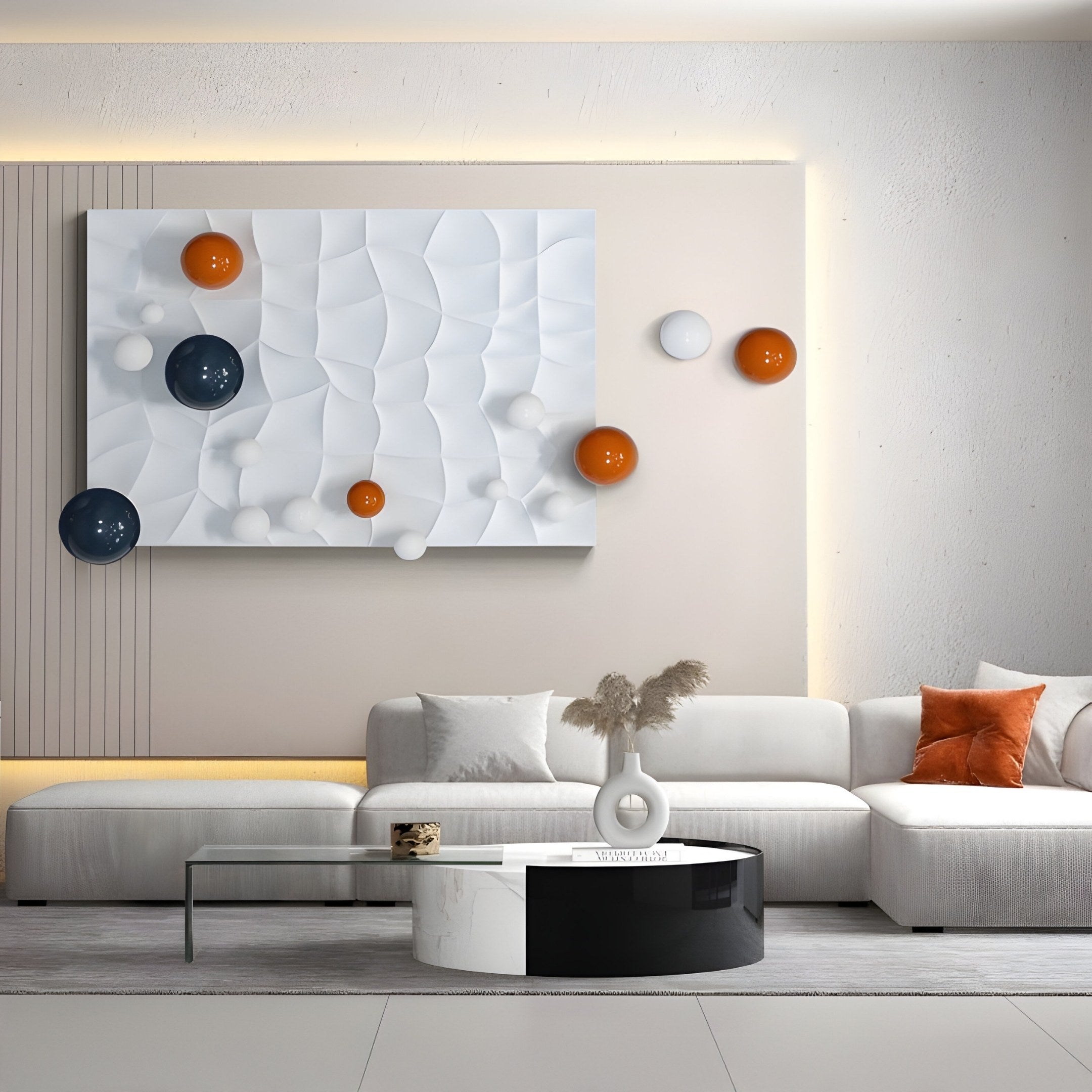 The Orbison White 3D Wood Relief Wall Art With Floating Metal Ball offers a distinctive horizontal composition that brings depth and style to contemporary interiors. Its wooden panel is carved into wave-like contours, creating a dynamic surface that interacts with both natural and artificial light. Placed across this textured background are spherical accents in orange, white, and a deep navy tone, each one polished to catch and reflect light at varying angles. This blend of colours and finishes contrasts with the crisp white relief, drawing attention to the piece’s layered design. The overall effect is reminiscent of an abstract oil painting brought into three dimensions, ensuring that each viewing angle offers something fresh and engaging.