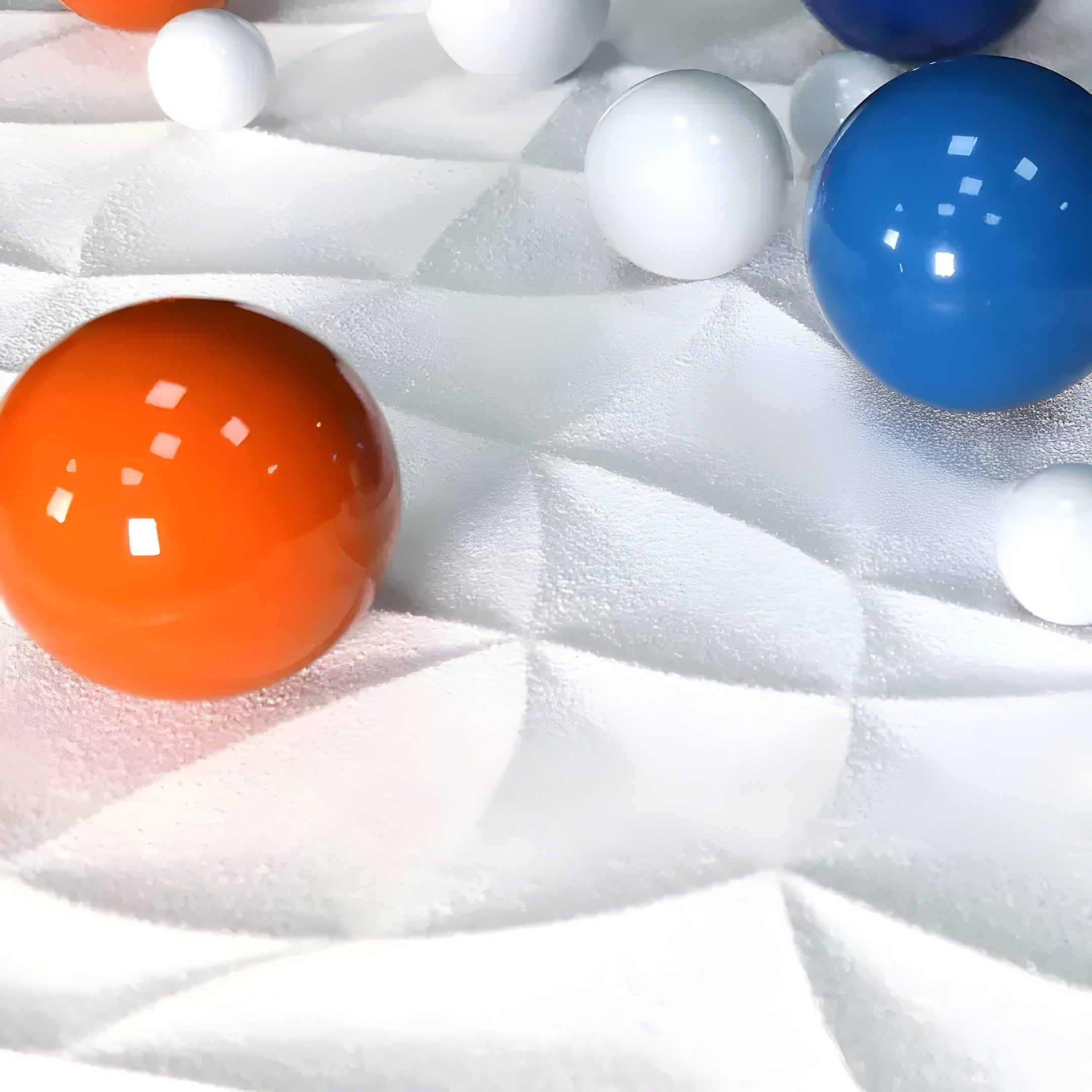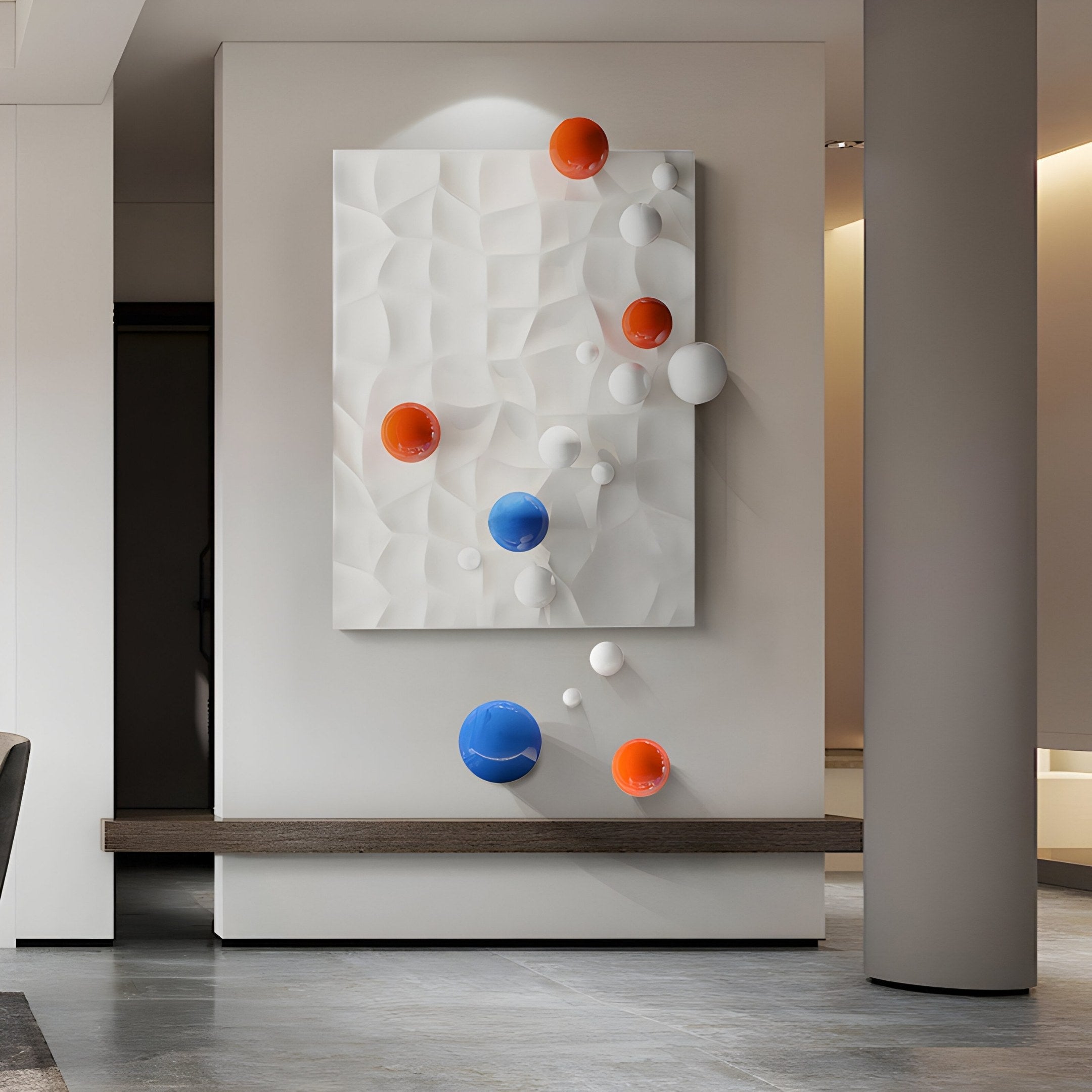 The Orbison White Vertical 3D Wood Relief Wall Art With Floating Metal Ball features a carved wooden panel with a wave-like texture, creating a subtle play of light and shadow. The panel’s surface is finished in a crisp white tone, giving it a clean backdrop for glossy orbs in orange, blue, and white. Each sphere appears to hover above the rippled pattern, introducing movement and contrast that sets this piece apart from conventional flat artworks. The careful interplay of colour, shine, and texture invites closer inspection, transforming any blank wall into a point of interest.