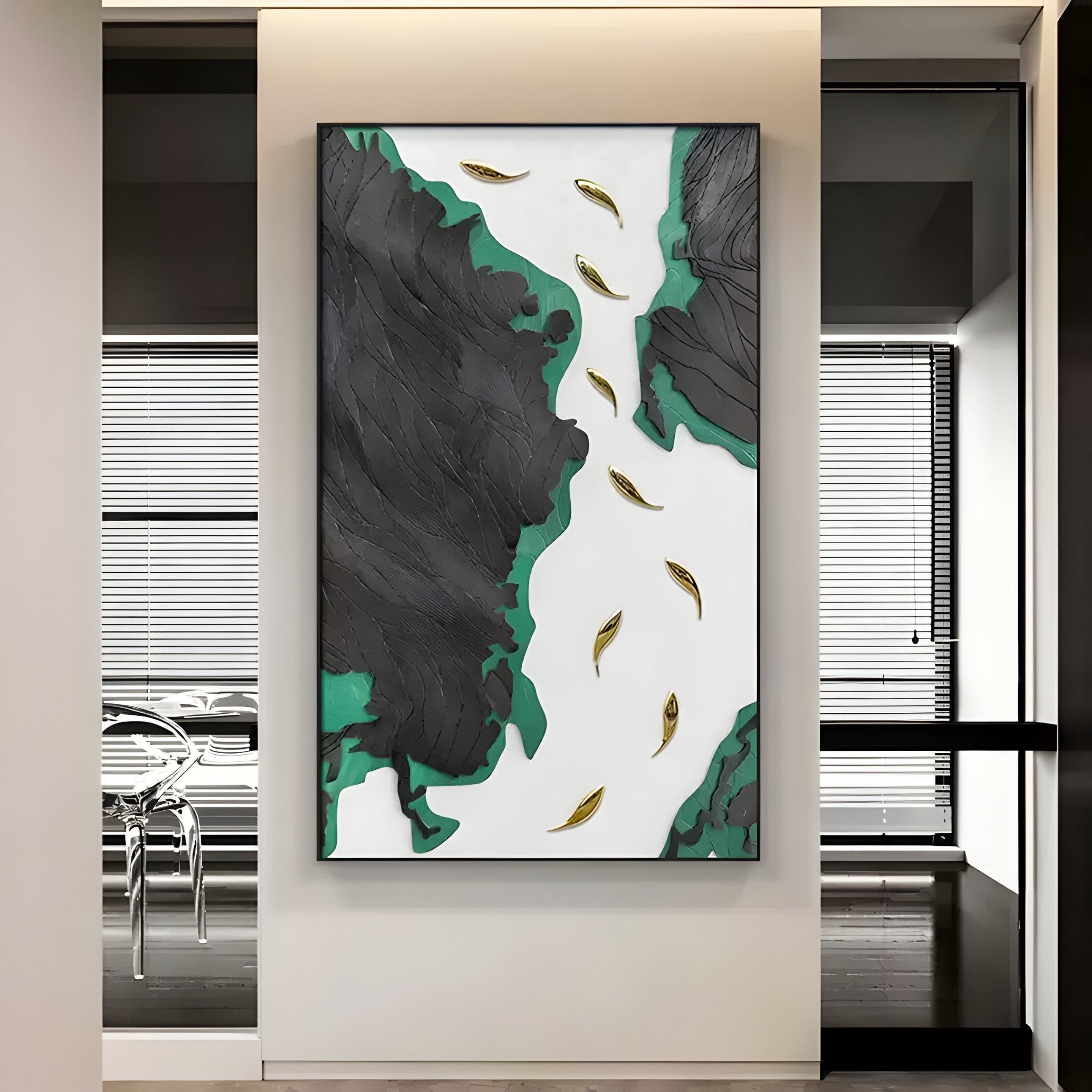 Bringing together a dramatic interplay of black contours, green accents, and a luminous white channel, the Prosper Black & Green Metallic Fish 3D Relief Wall Art showcases nine glimmering gold-tone fish. Each carved from a sandstone-like material, the background features ridged sections that evoke rugged stone or forested terrain, while the serene white passage through the centre suggests a tranquil waterway. Arranged in a vertical flow, the electroplated fish appear to swim upwards, conveying a sense of prosperity and renewed energy. Whether placed in a living room, a lofty villa interior, or a refined entrance hall, the panel’s visually balanced design and uplifting imagery make it a worthy focal point.